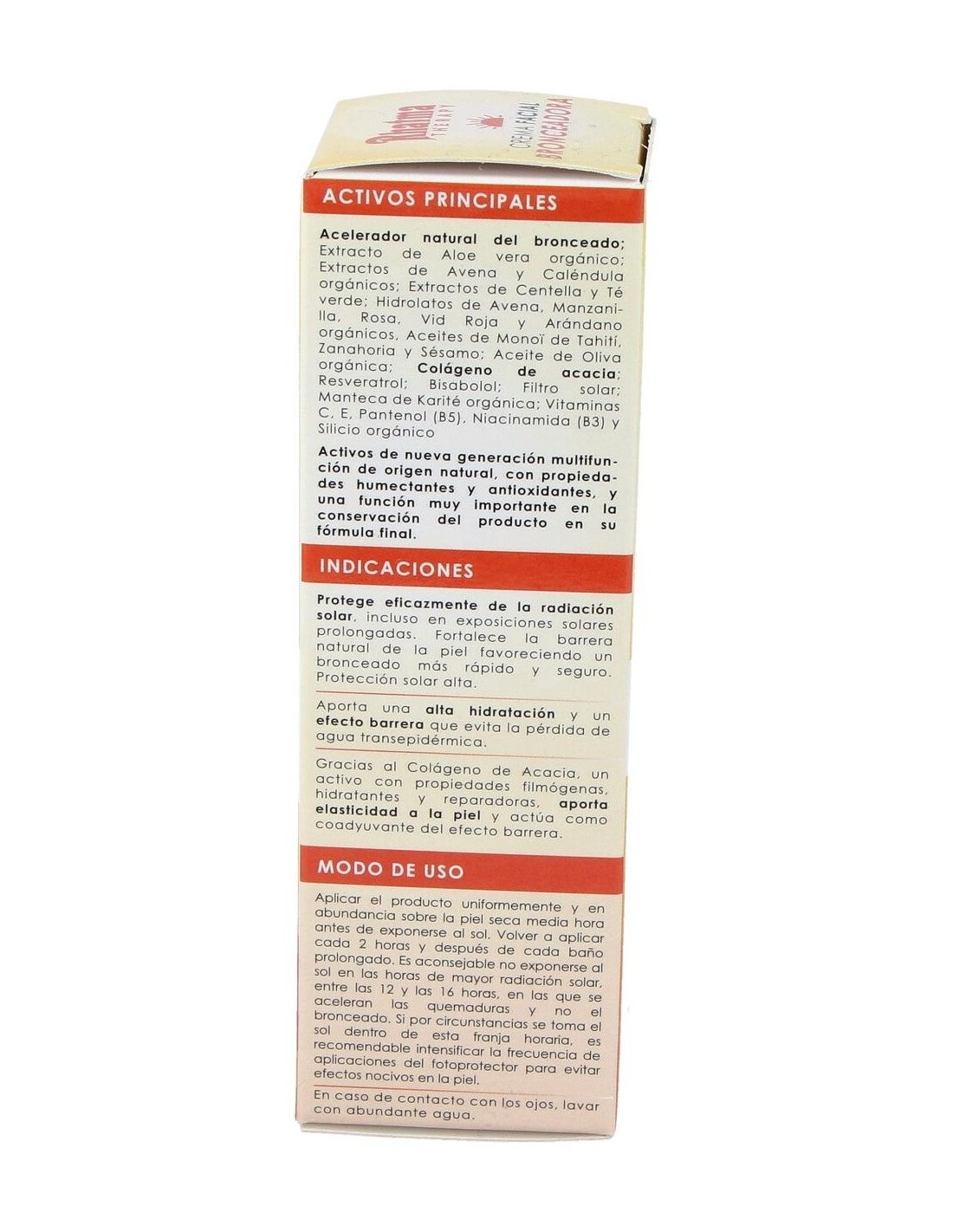 Crema facial bronceadora que fortalece la barrera natural de la piel favoreciendo un bronceado más rápido y seguro. Protección solar alta, factor 30. Aporta una alta hidratación y un efecto barrera que evita la pérdida de agua transepidérmica. Gracias al colágeno de acacia, un activo con propiedades filmógenas, hidratantes y reparadoras, aporta elasticidad a la piel y actúa como coadyuvante del efecto barrera.