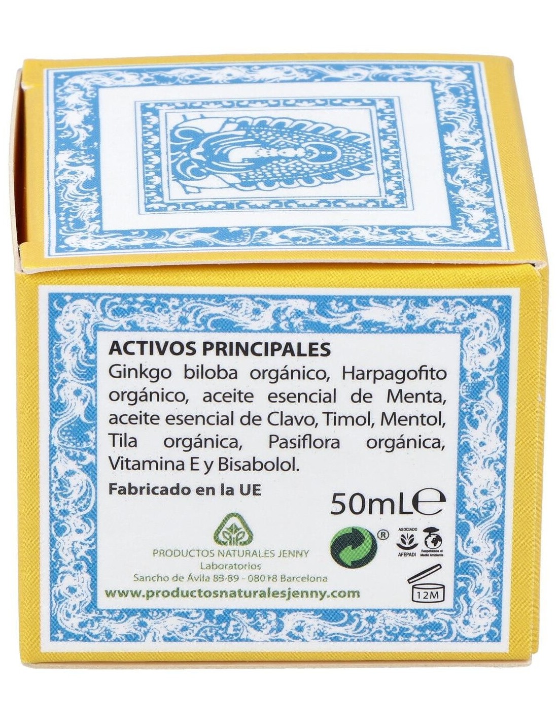 Ginkgo Biloba, Harpagofito, Nuez verde, aceites esenciales de Menta, Clavo, Timol y Mentol.