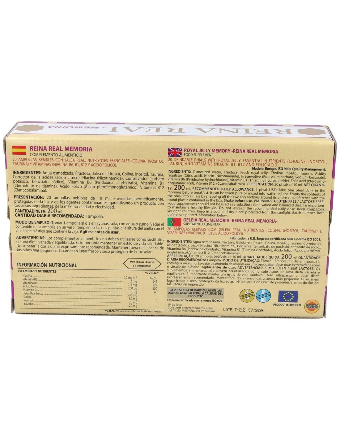 Jalea real fresca, Colina, Inositol, Taurina, Vitaminas: B1 (clorhidrato de tiamina), B3 (nicotinamida), B6 (clorhidrato de piridoxina) y B12 (cianocobalamina); Folato (ácido pteroilmonoglutámico), fructosa, conservador (sorbato potásico, benzoato sódico), corrector de la acidez (ácido cítrico) y agua purificada.