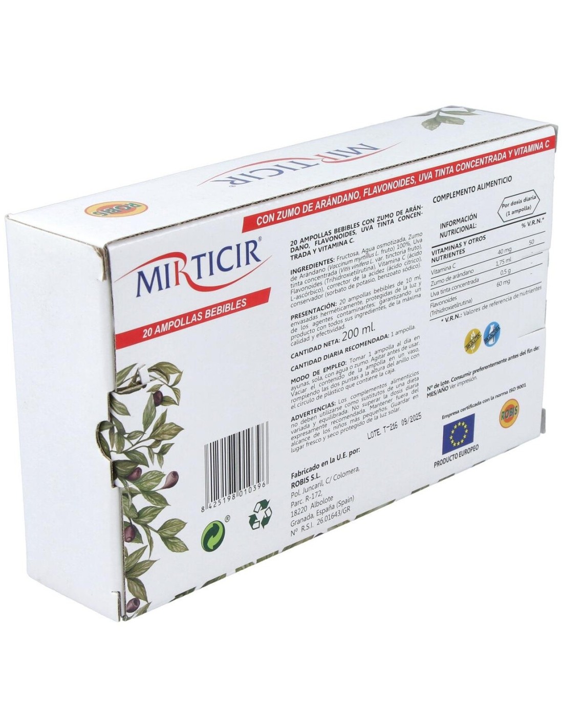 Zumo de arándano 100% (Vaccinum myrtillus L.), Uva tinta concentrada (Vitis vinifera L. var. tinctoria), Flavonoides (trihidroxietilrutina), Vitamina C (ácido L ascórbico), fructosa, conservador (sorbato potásico, benzoato sódico), corrector de la acidez (ácido cítrico) y agua purificada.