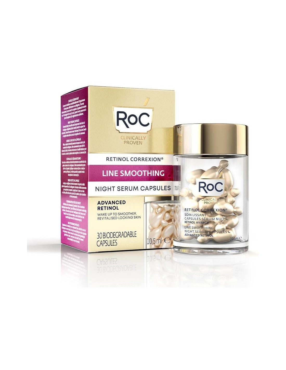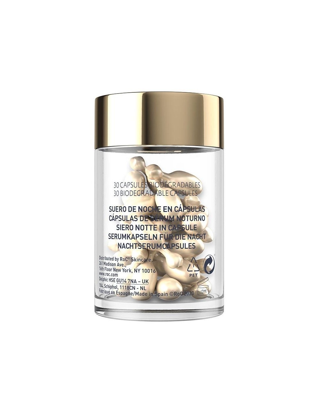 Este Sérum en cápsulas de noche suaviza y mejora visiblemente la apariencia de piel sin colágeno, para proporcionar un acabado sedoso y renovado, gracias una alta concentración de Retinol puro.