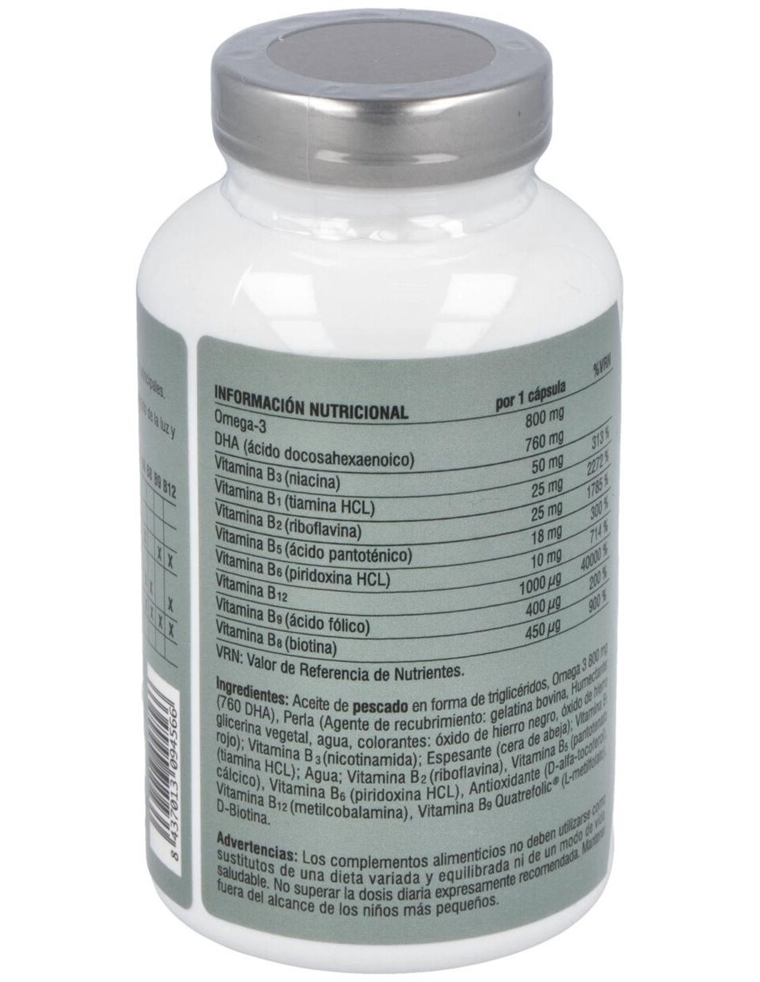 Aceite de pescado DHA 760 TG (76%), Perla (Agente de recubrimiento: gelatina bovina, Humectante: glicerina vegetal): Vitamina B3 (nicotinamida 50 mg): Espesante (cera de abeja 30 mg): Vitamina B1 (tiamina HCL 25 mg): Agua: Vitamina B2 (riboflavina 25 mg), Vitamina B5 (pantotenato cálcico 18,00 mg), Vitamina B6 (piridoxina HCL 10 mg), Antioxidante (D-alfa-tocoferol 10 mg), Perla (Colorantes: óxido de hierro negro, óxido de hierro rojo), Vitamina B12 (metilcobalamina 1,000 µg), Vitamina B9 Quatrefolic® (L-metilfolato 400 µg), Biotina (450 µg).