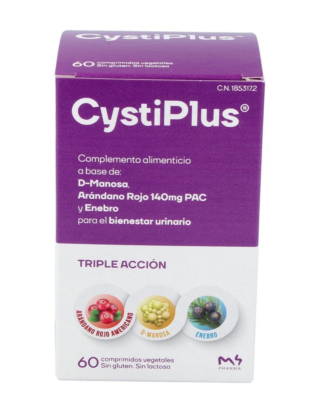 Suplemento a base de arándano rojo 140 mg PAC (proantocianidinas), D-manosa, y enebro para apoyar el bienestar urinario.