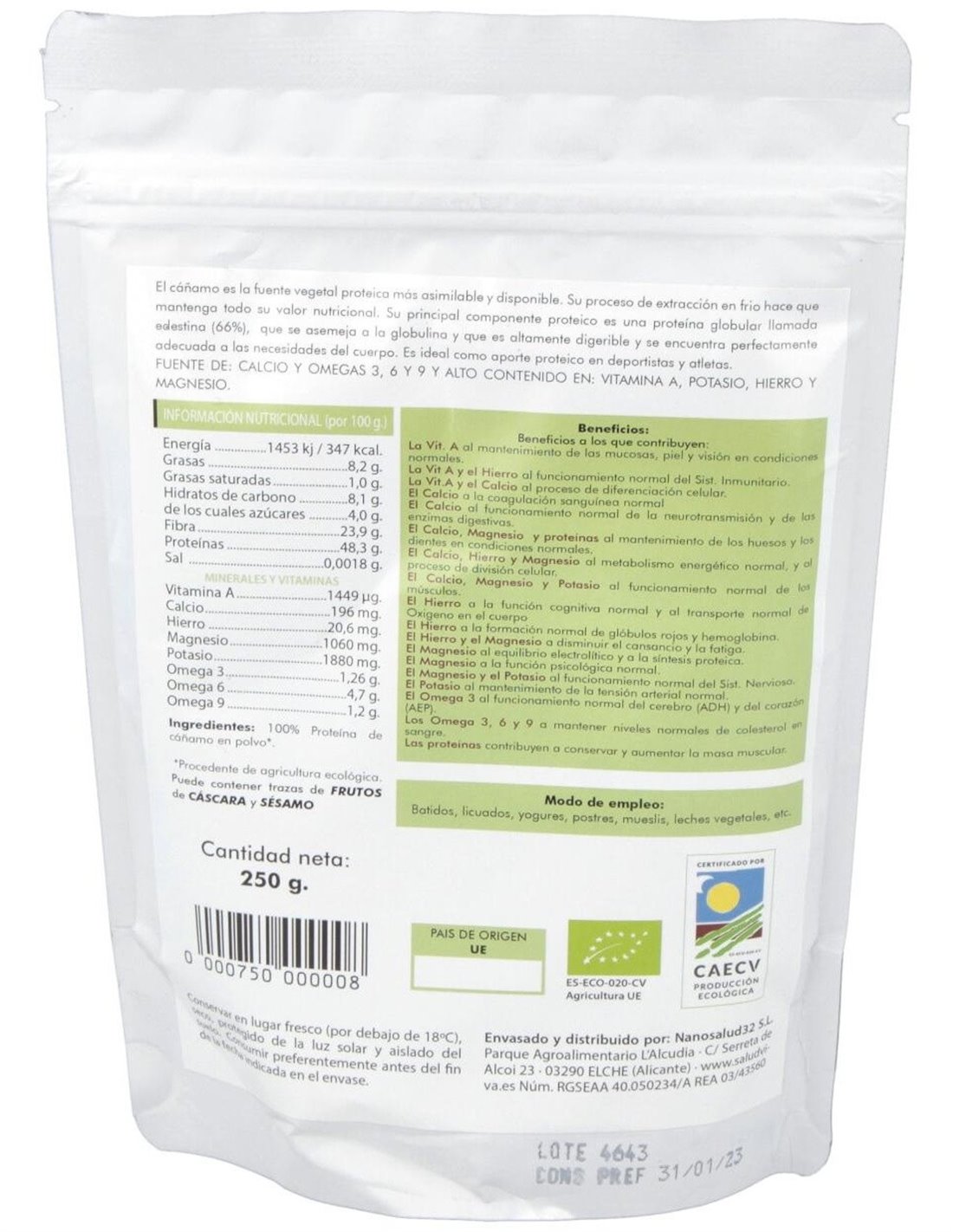 Proteína de cáñamo 100% ecológico.