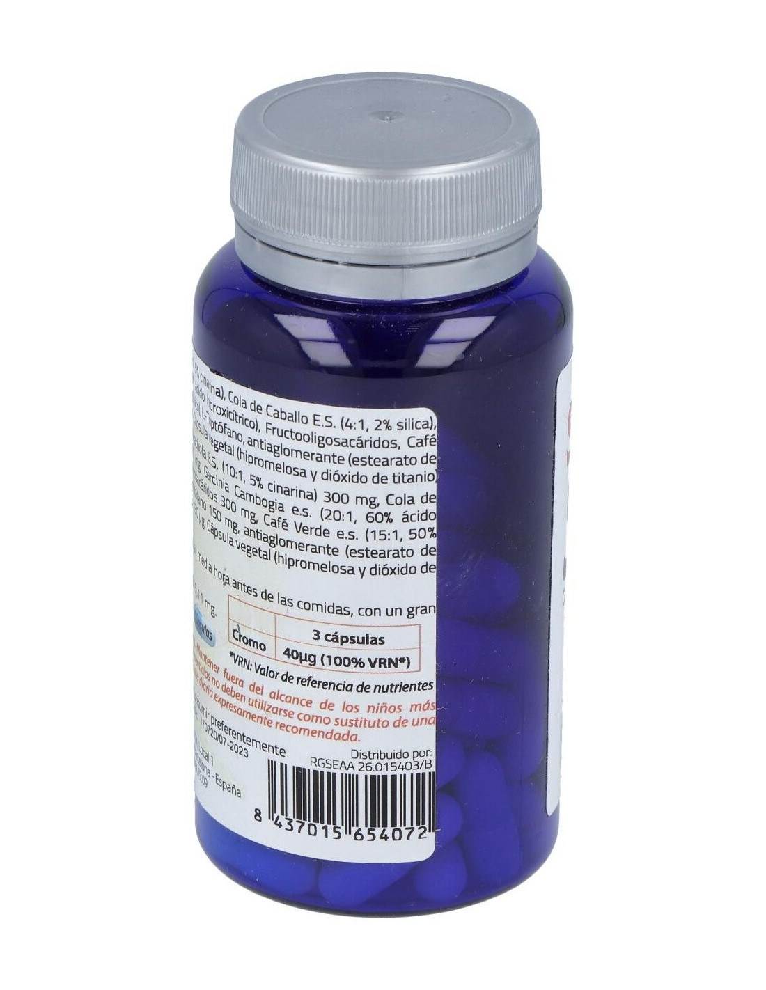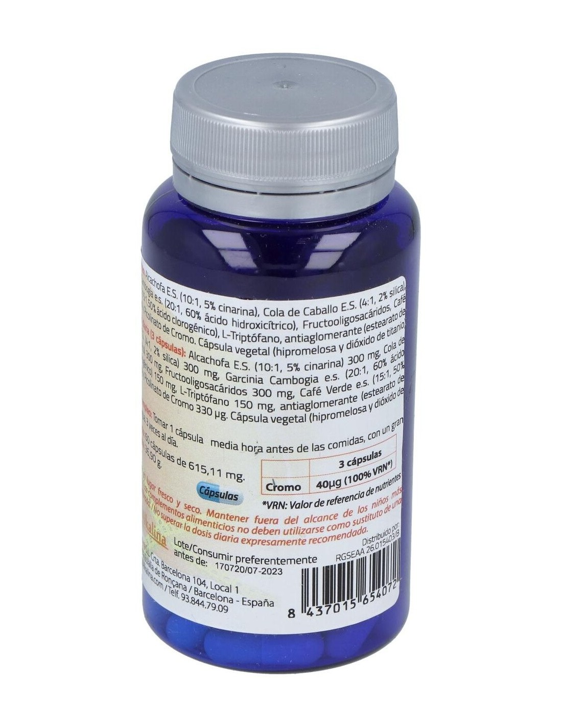 Garcinia Cambogia........................... 500 mg Café Verde ......................................400 mg L-Carnitina ......................................180 mg E.S. Cola de caballo .........................180 mg E.S. Estigmas de maíz ......................100 mg E.S. Hinojo .....................................100 mg E.S.Romero ....................................100 mg Picolinato de Cromo .........................0,80 mcg