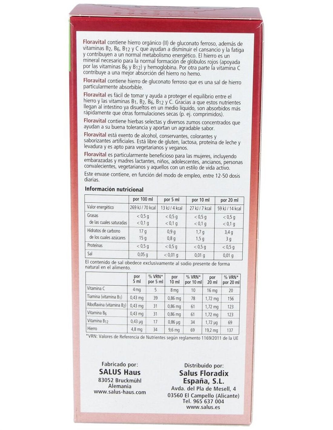 Floravital es un tónico muy similar a Floradix y con la misma finalidad, aportar al organismo hierro nutricional. Sin embargo, ha sido especialmente concebido para los colectivos que no pueden tomar Floradix por ser intolerantes a alguno de sus ingredientes. Contiene hierro orgánico, además de vitaminas B2, B6, B12 y C que ayudan a disminuir el cansancio y la fatiga y contribuyen a un normal metabolismo energético. Es particularmente beneficioso para las mujeres (incluyendo embarazadas y madres lactantes) niños, adolescentes, ancianos, personas convalecientes, vegetarianos y personas con un estilo de vida activo.