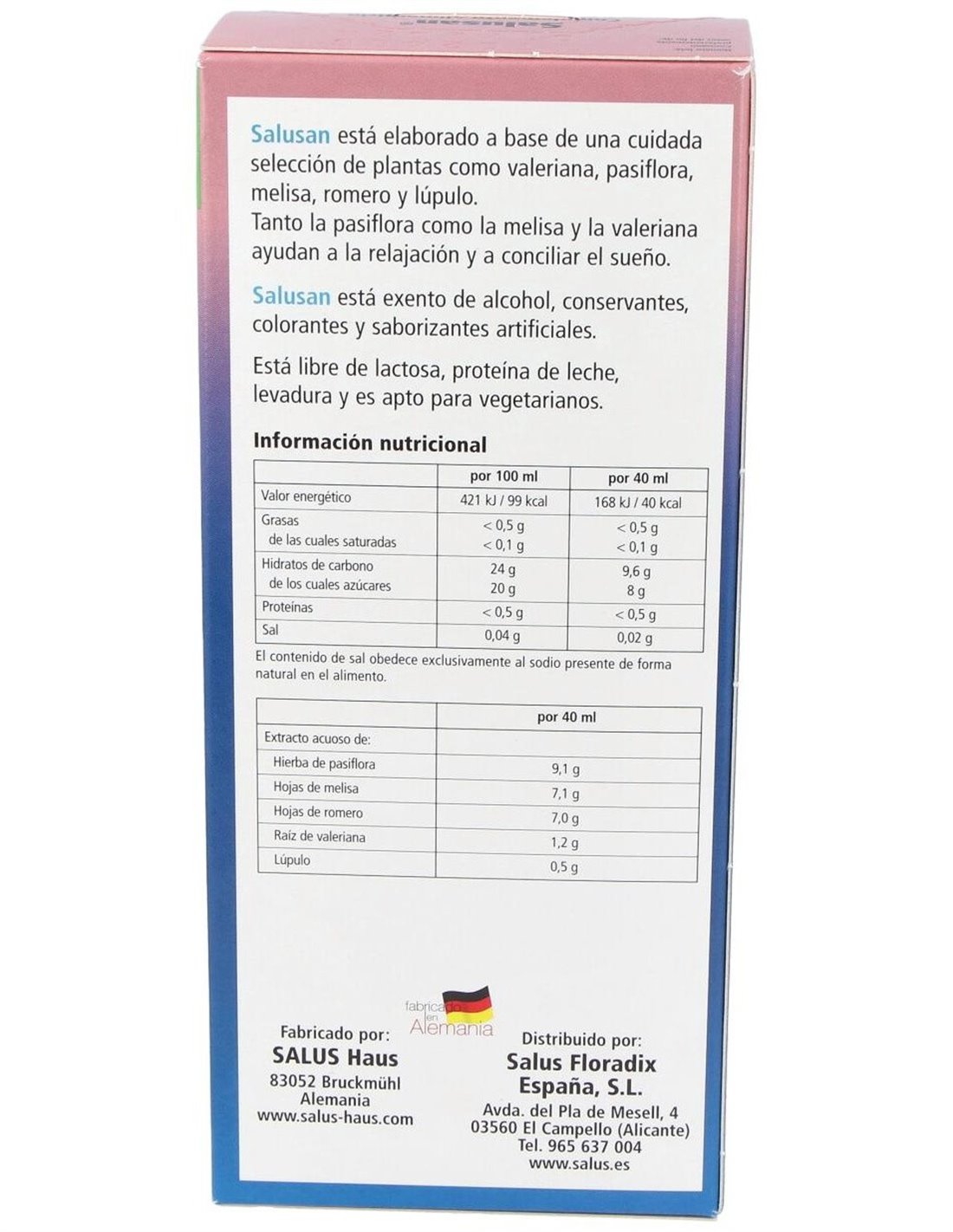 Extracto acuoso (72%) de: pasiflora, hojas de melisa, hojas de romero, caña de limón, germen de trigo, germen de cebada, raíz de valeriana, lúpulo, corteza de limón, lupulina. Miel, concentrado de zumo de pera, aromas naturales, aceite esencial de limón.