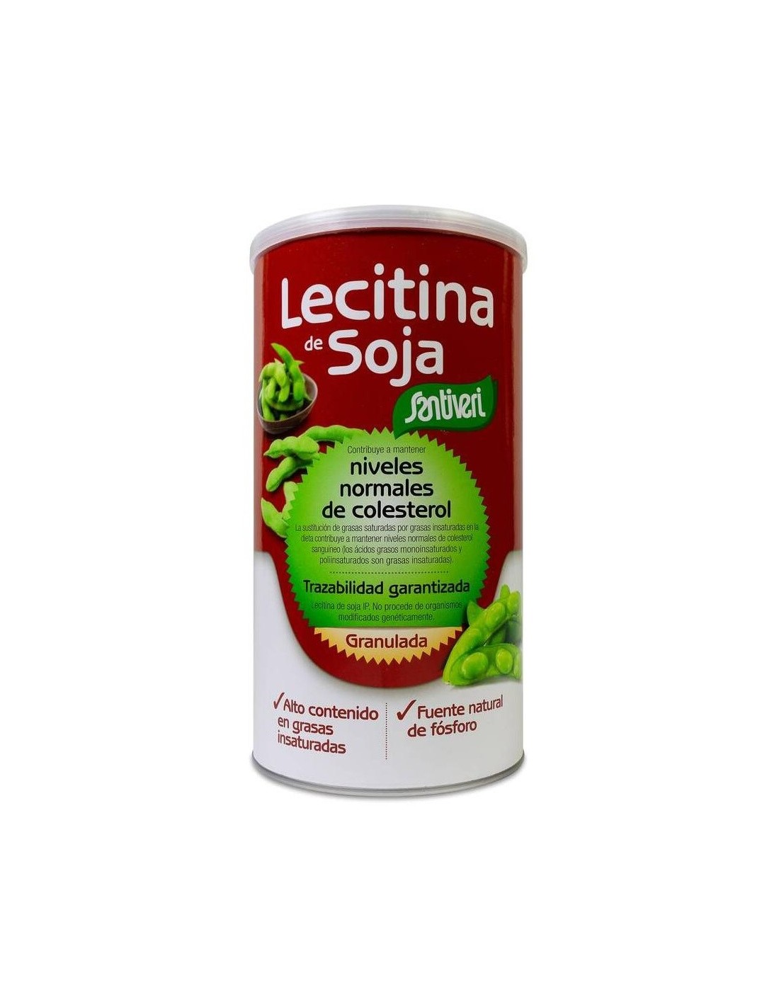 Santiveri lecitina de soja es un rico complejo, compuesto a base de fosfolípidos naturales de la semilla de soja, que regula y controla los niveles de colesterol en sangre, para evitar taponamientos en las arterias. Los fosfolípidos contribuyen a mejorar el transpore de los lípidos plasmáticos y mejorar el metabolismo del colesterol.