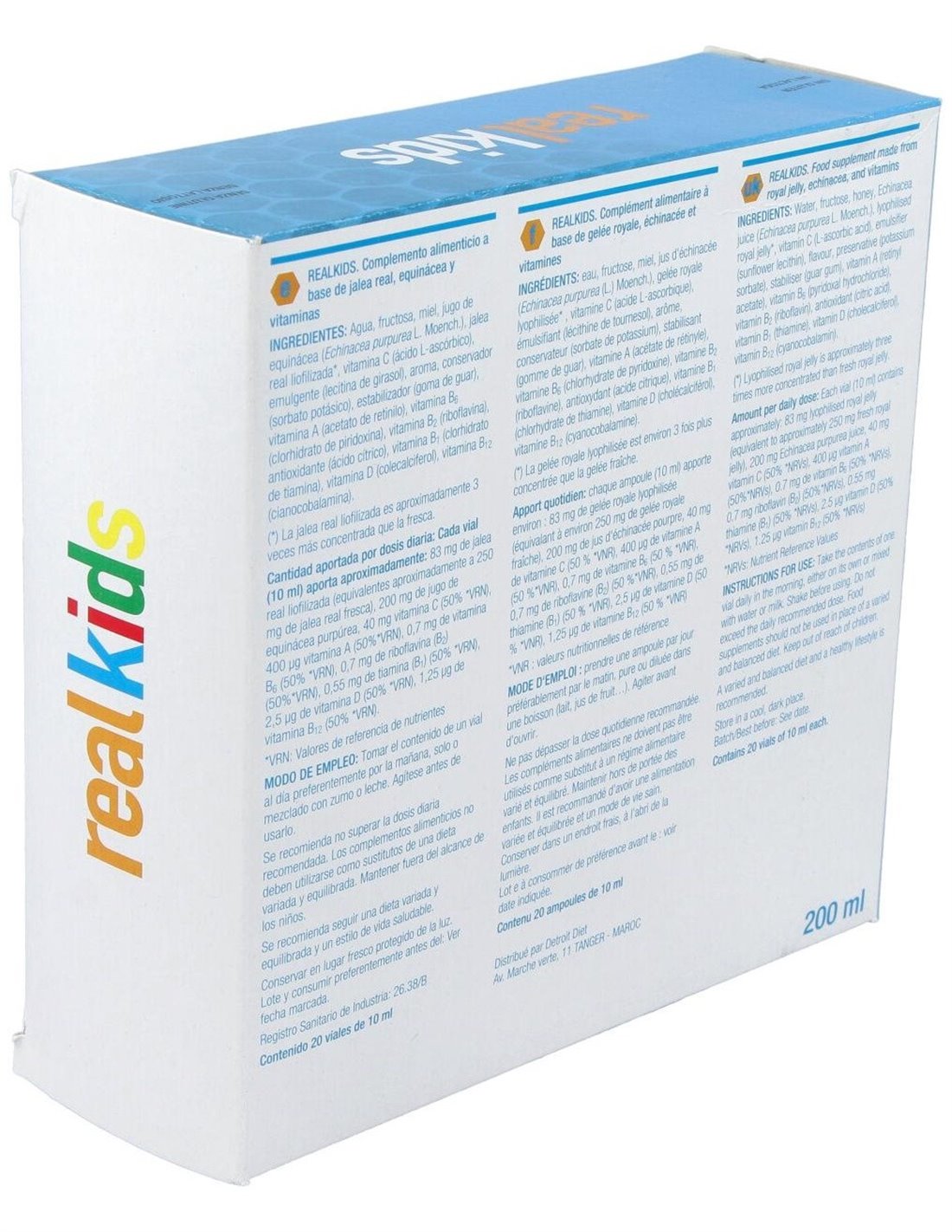Complemento alimenticio a base de Jalea Real Certificada + vitamina D, que es necesaria para el crecimiento y el desarrollo normales de los huesos de los niños.