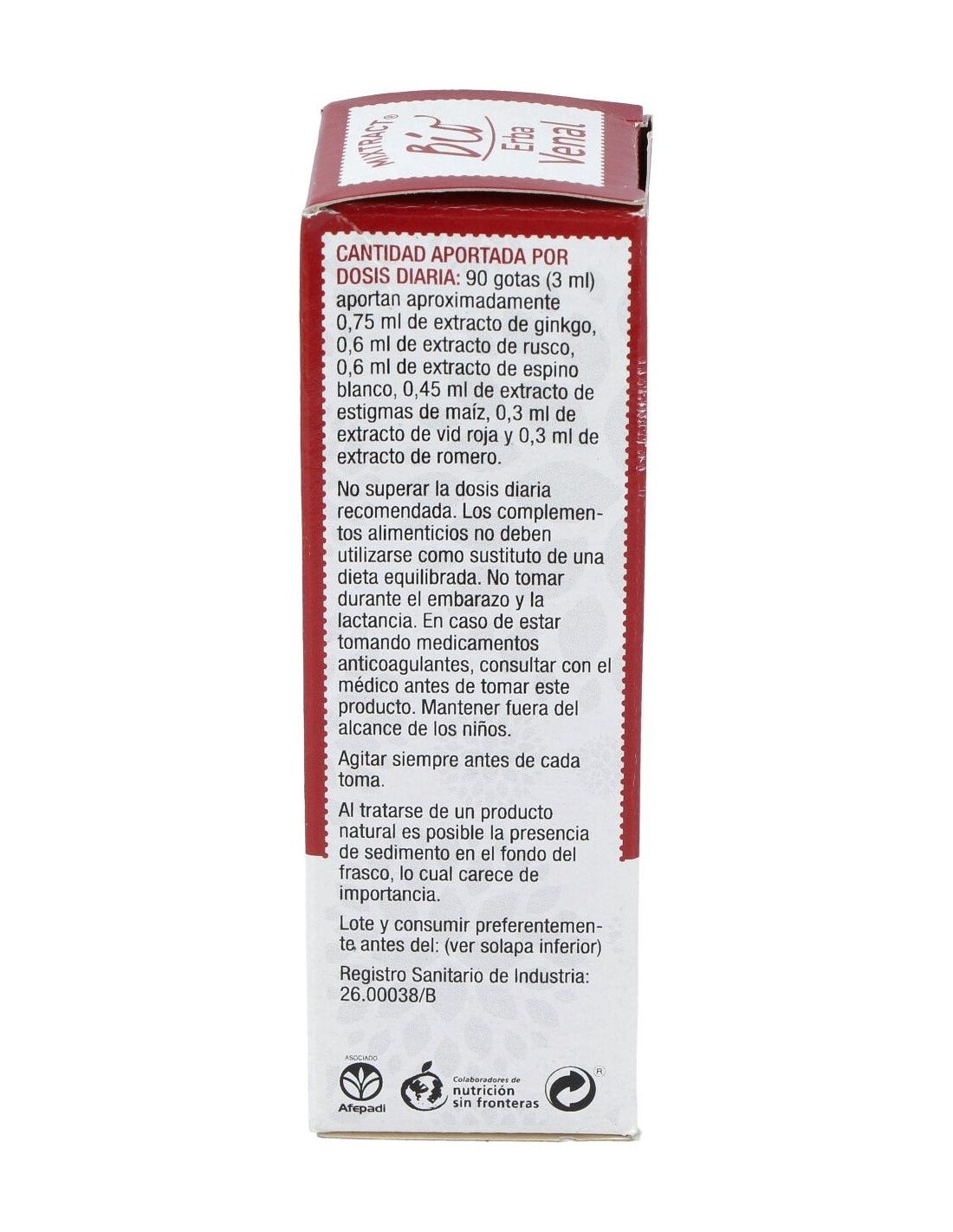 0,75 ml de extracto de ginkgo, 0,6 ml de extracto de rusco, 0,6 ml de extracto de espino blanco, 0,45 ml de extracto de estigmas de maíz, 0,3 ml de extracto de vid roja y 0,3 ml de extracto de romero.