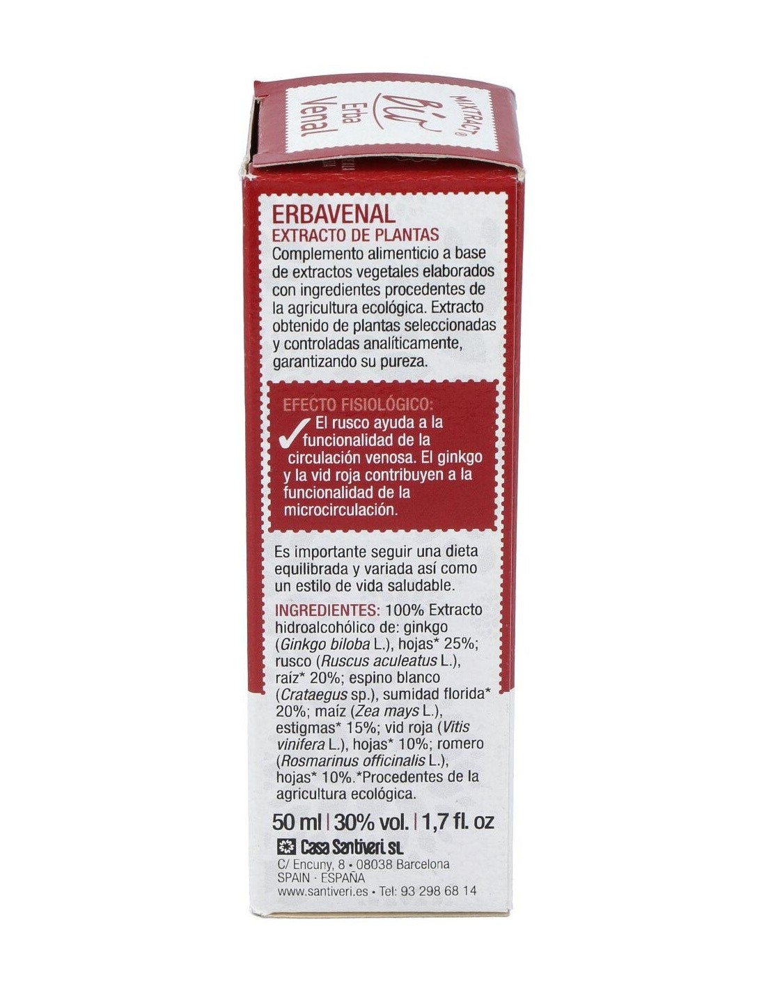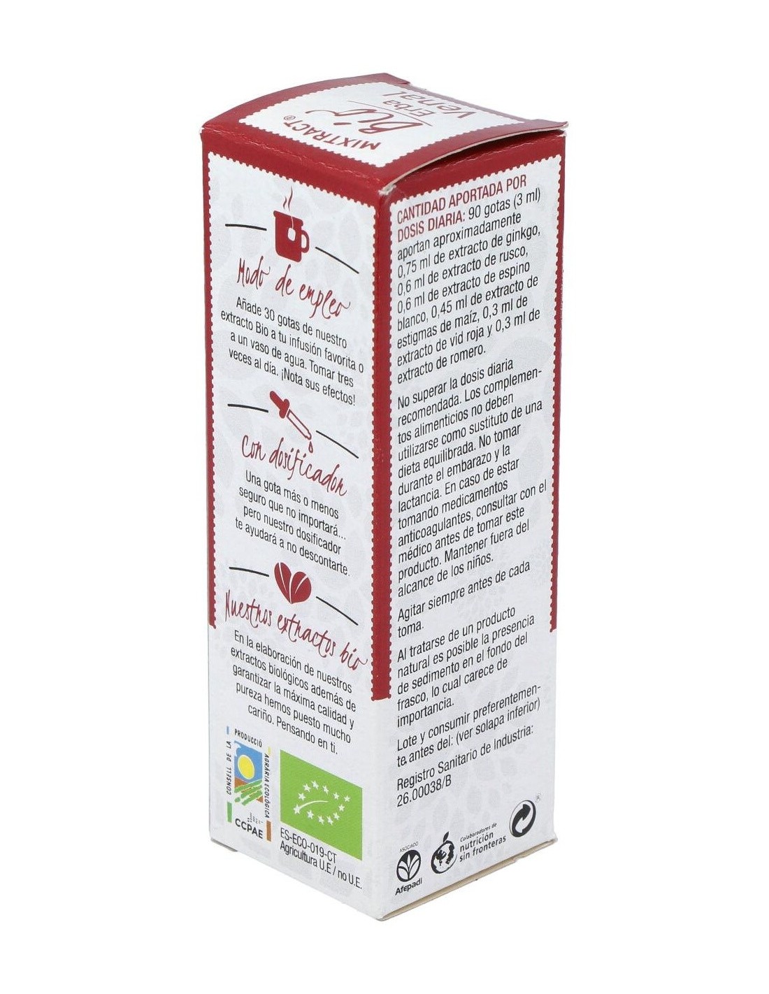 100% Extracto hidroalcohólico de: ginkgo (Ginkgo biloba L.) hojas* 25%, rusco (Ruscus aculeatus L.) raíz* 20%, espino blanco (Crataegus sp.) sumidad florida* 20%, maíz (Zea mays L.) estigmas* 15%, vid roja (Vitis vinifera L.) hojas* 10%, romero (Rosmarinus officinalis L.) hojas* 10%.