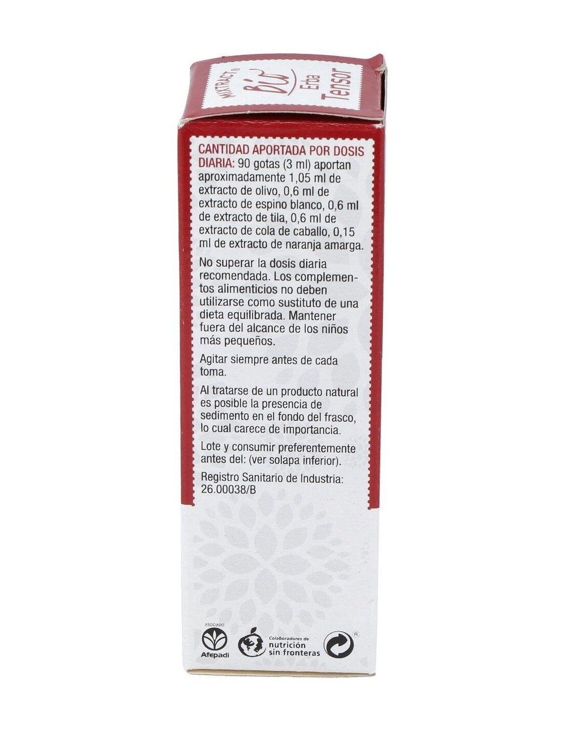 1,05 de extracto de olivo, 0,6 ml de extracto de espino blanco, 0,6 ml de extracto de tila, 0,6 ml de extracto de cola de caballo, 0,15 ml de extracto de naranjo amargo.