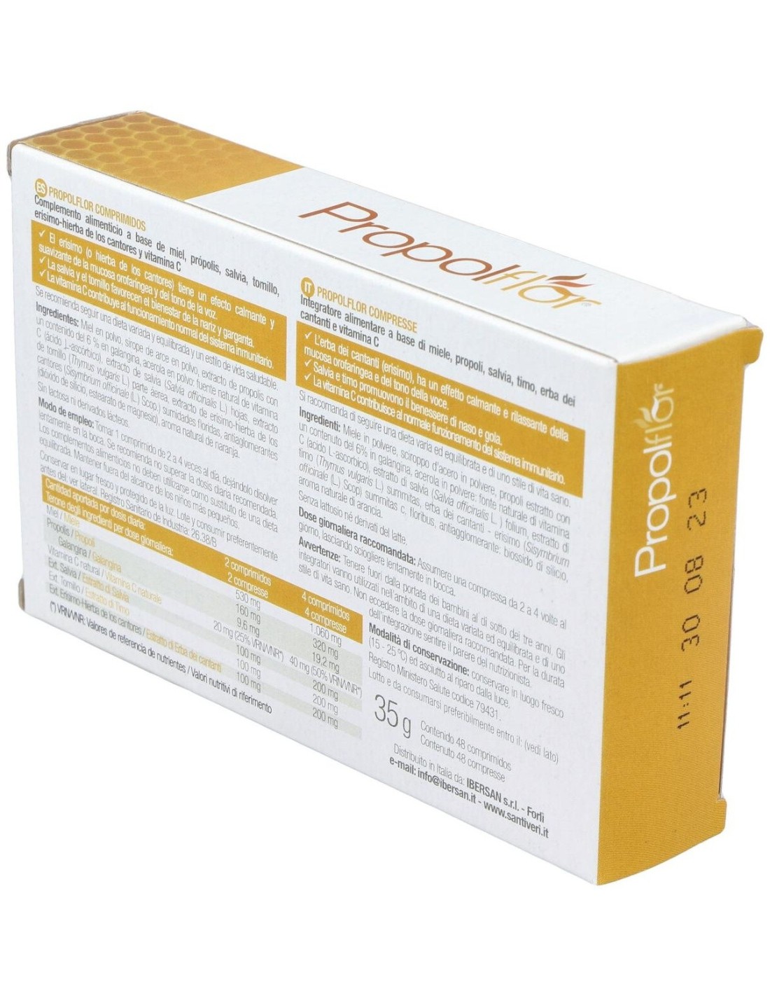 530 mg de miel, 160 mg de extracto de própolis (9,6 mg de galangina), 20 mg de vitamina C de origen natural (25 % VRN), 100 mg de extracto de salvia, 100 mg de extracto de tomillo y 100 mg de extracto de erísimo-hierba de los cantores.