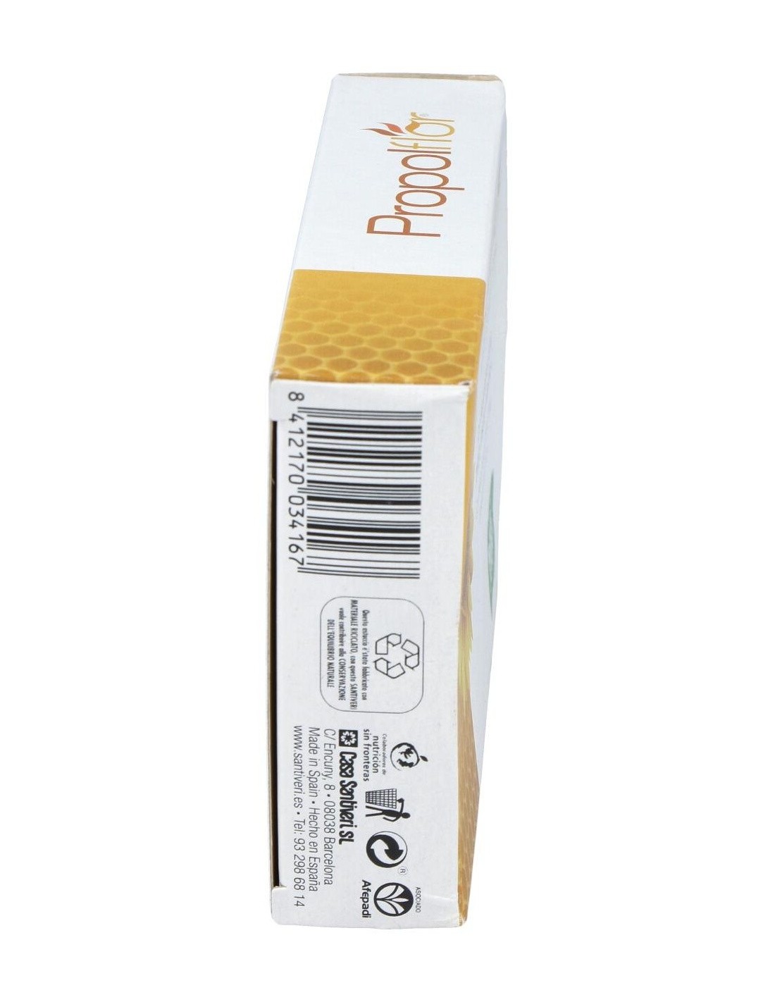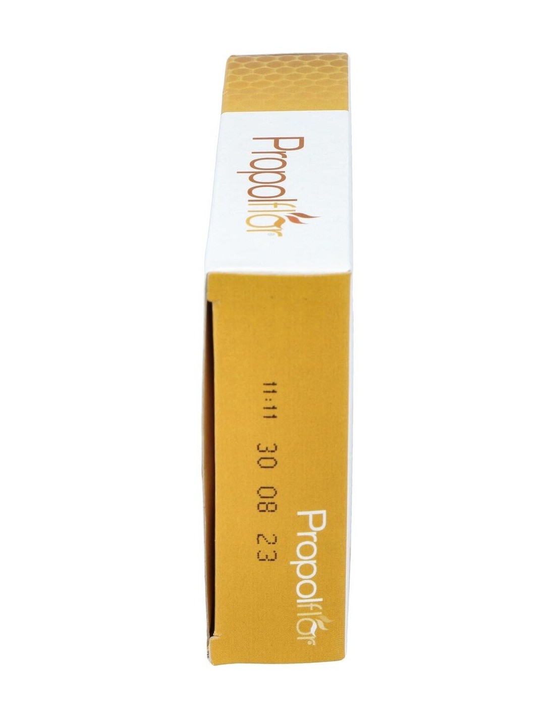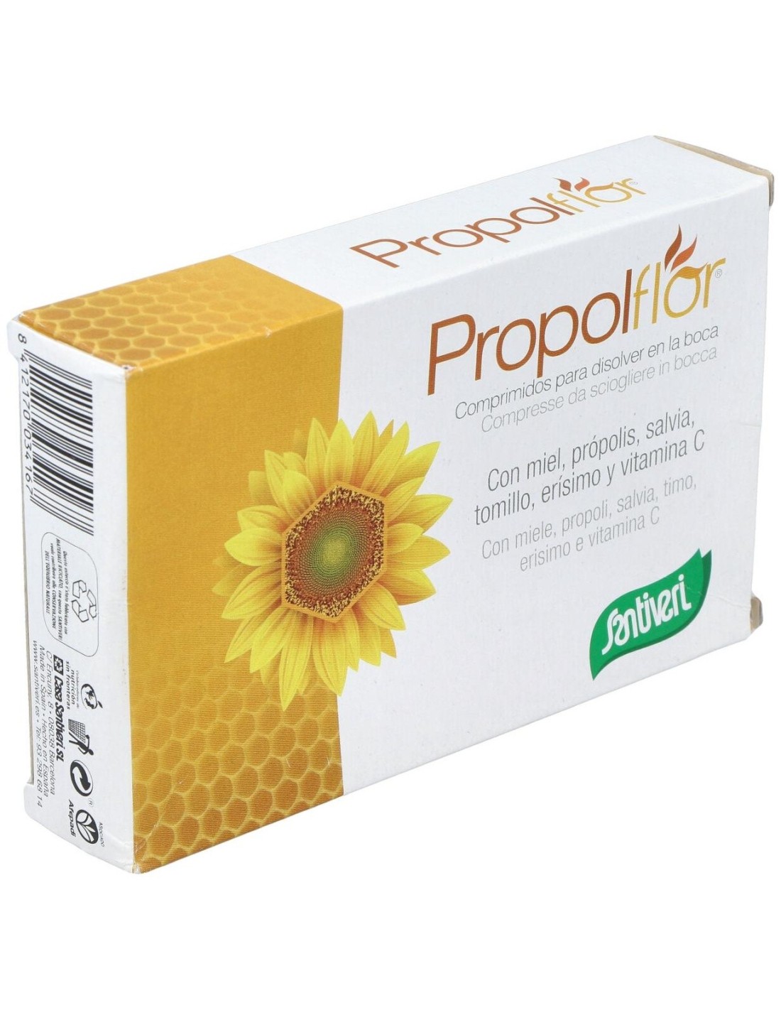 Miel en polvo, sirope de arce en polvo, extracto de própolis con un contenido del 6 % en galangina, acerola en polvo: fuente natural de vitamina C (ácido L-ascórbico), extracto de salvia (Salvia officinalis L.) hojas, extracto de tomillo (Thymus vulgaris L.) parte aérea, extracto de erísimo-hierba de los cantores (Sisymbrium officinale (L.) Scop.) sumidades floridas, antiaglomerante: dióxido de silicio, aroma natural de naranja.