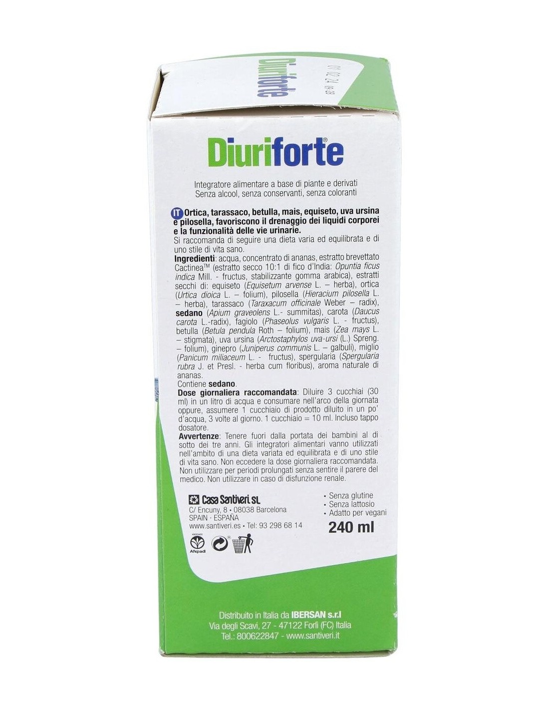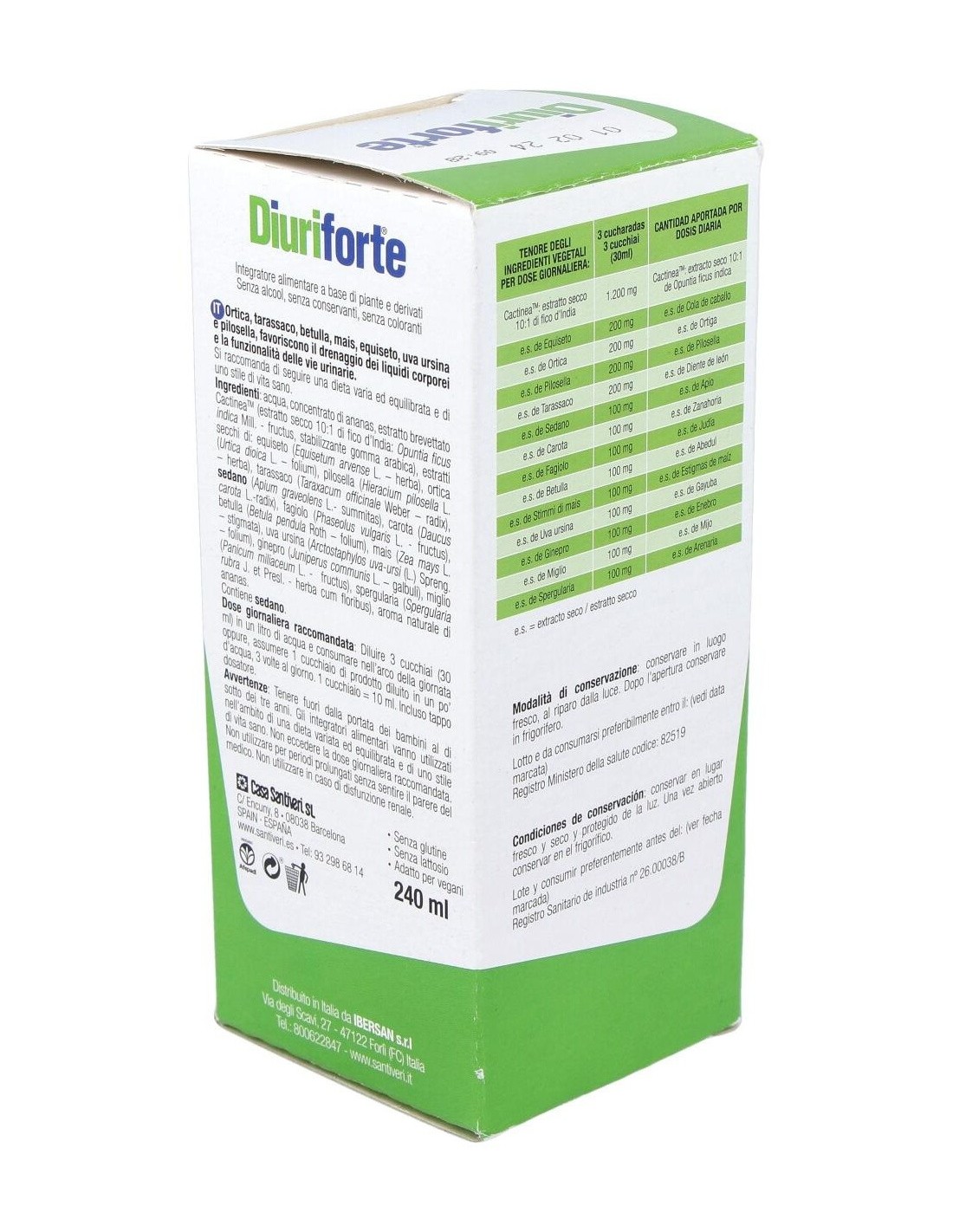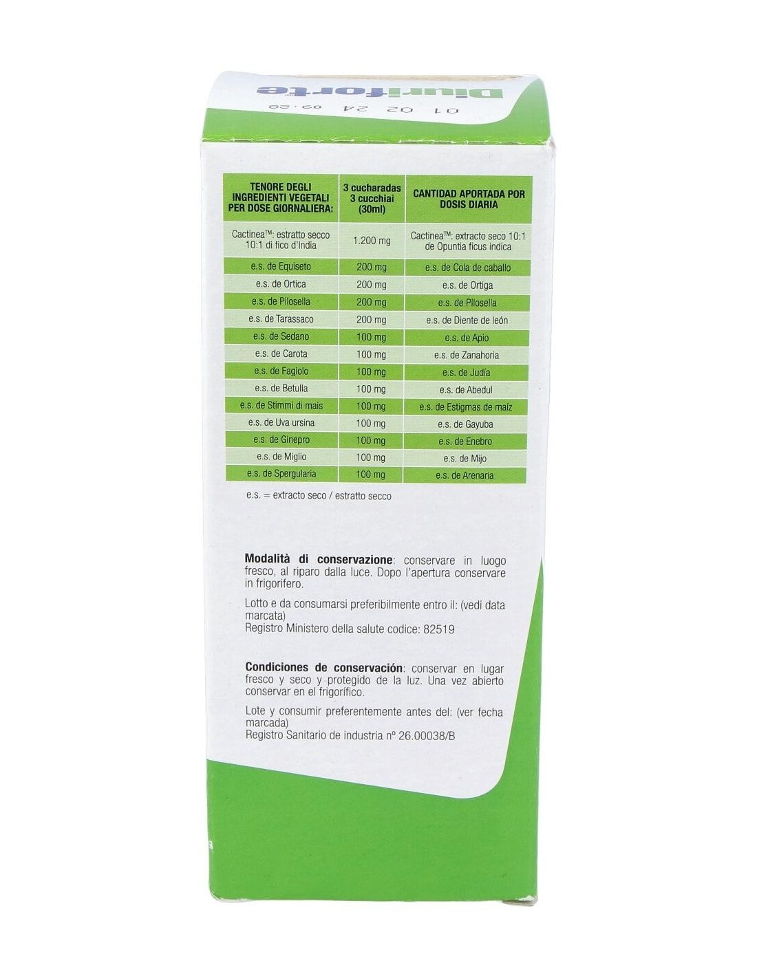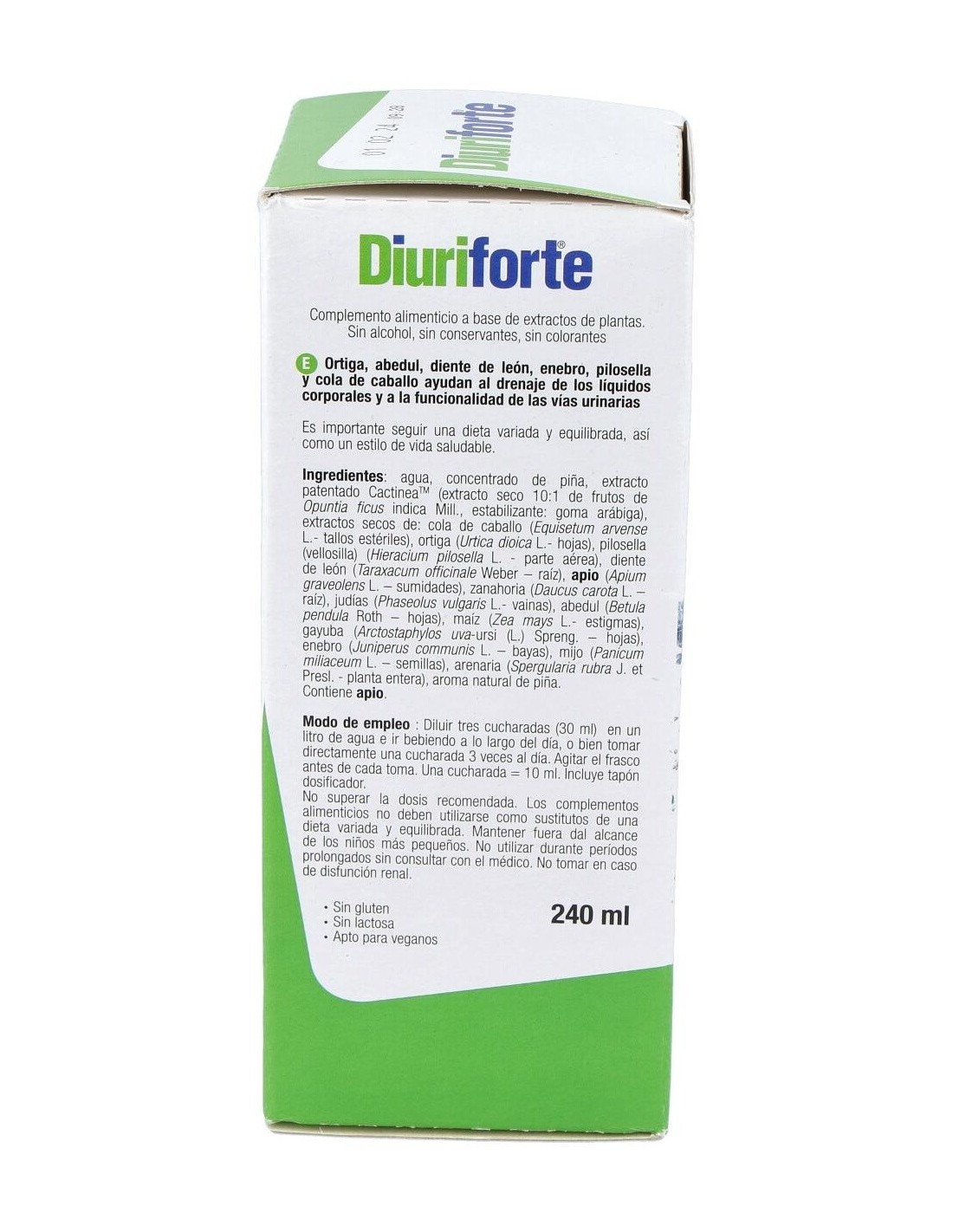Concentrado de piña y manzana: 10 % Extracto concentrado de: apio (Apium graveolens L.) raiz, zanahoria (Daucus carota L.) raíz, ortiga (Urtica dioica L.) hojas, judías (Phaseolus vulgaris L.) vainas, abedul (Betula pendula Roth) corteza, maíz (Zea mays L.) estigmas, gayuba (Arctostaphylos uva-ursi (L.) Spreng.) hojas, diente de león (Taraxacum officinale Weber) planta entera, enebro (Juniperus communis L.) bayas, mijo del sol (Lithospermum officinale L.) hojas, arenaria (Spergularia rubra J. et Presl.) planta entera, parietaria (Parietaria officinalis L.) planta entera, abedul (Betula pendula Roth ) hojas: Sirope de savia de arce: Extracto seco de ortiga verde (Urtica dioica L.) hojas: Extracto seco de cola de caballo (Equisetum arvense L.) tallos estériles: Extracto seco de pilosela (vellosilla) (Hieracium pilosella L.) parte aérea: Extracto seco de diente de león (Taraxacum officinale Weber.) raíz: aroma natural de piña.