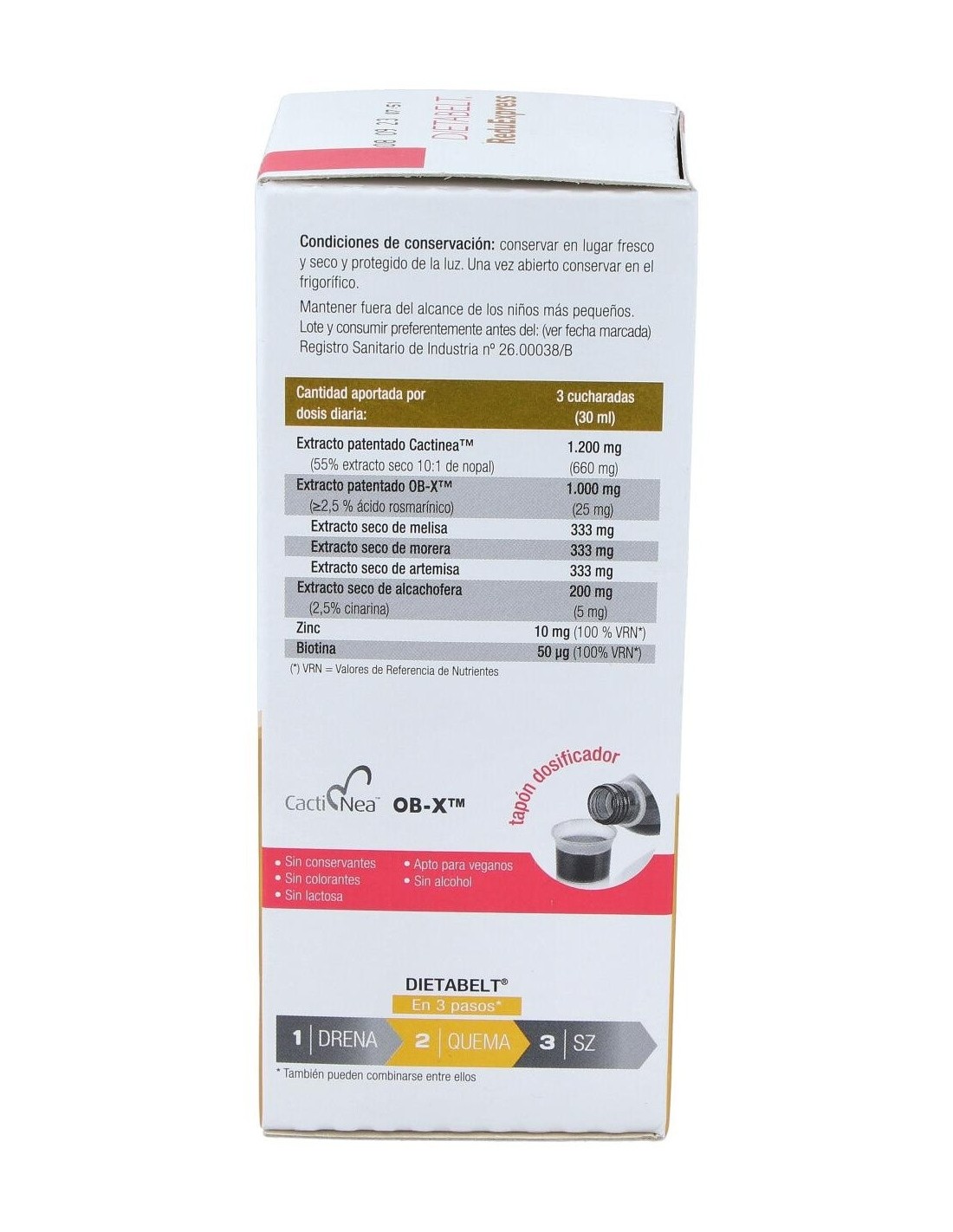 1.200 mg de extracto patentado CactineaTM (660 mg de extracto seco 10:1 de nopal). 1.000 mg de extracto patentado OB-X TM (25 mg de ácido rosmarínico) constituido por 333 mg de extracto seco de melisa, 333 mg de extracto seco de morera y 333 mg de extracto seco de artemisia. 200 mg de extracto seco de alcachofera al 2,5% en cinarina (5 mg de cinarina). 10 mg de zinc (100 % VRN). 50 µg de biotina