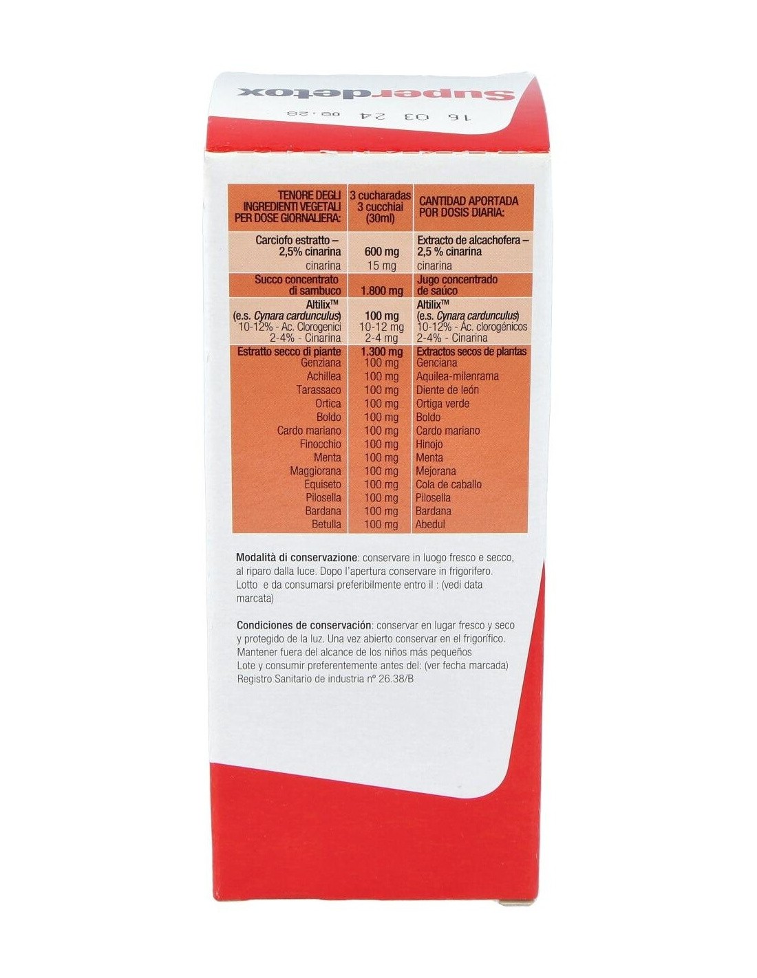 Extracto concentrado de plantas: 45,8% [genciana (Gentiana lutea L. raíz), diente de león (Taraxacum officinale Weber. planta), achillea-milenrama (Achillea millefolium L.- sumidades floridas), cúrcuma (Curcuma longa L. rizoma), boldo (Peumus boldus Molina hojas), ortiga blanca (Lamium album L. sumidad), hinojo (Foeniculum vulgare Miller fruto), manzanilla (Matricaria chamomilla L. - capítulos florales), menta (Menta piperita L. hojas), mejorana (Majorana hortensis Moench. hojas), cardo santo (Cnicus benedictus L. - planta entera), alcachofera (Cynara scolymus L. hojas), zarzaparrilla (Smilax officinalis H.B.K. raíz), saúco (Sambucus nigra L. flores), ortiga verde (Urtica dioica L. hojas), cola de caballo (Equisetum arvense L. - tallos estériles), abedul (Betula pendula Roth. hojas), bardana (Arctium lappa L. raíz), trébol de agua (Menyanthes trifoliata L. - hojas)], fructosa, extracto de alcachofera (Cynara scolymus L. hojas) titulado al 2,5% en cinarina) y aromas.