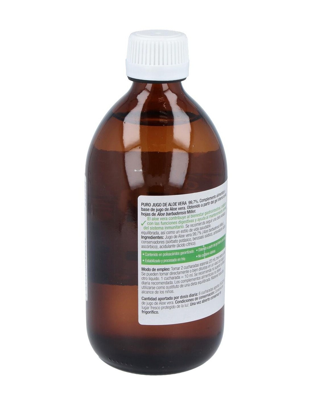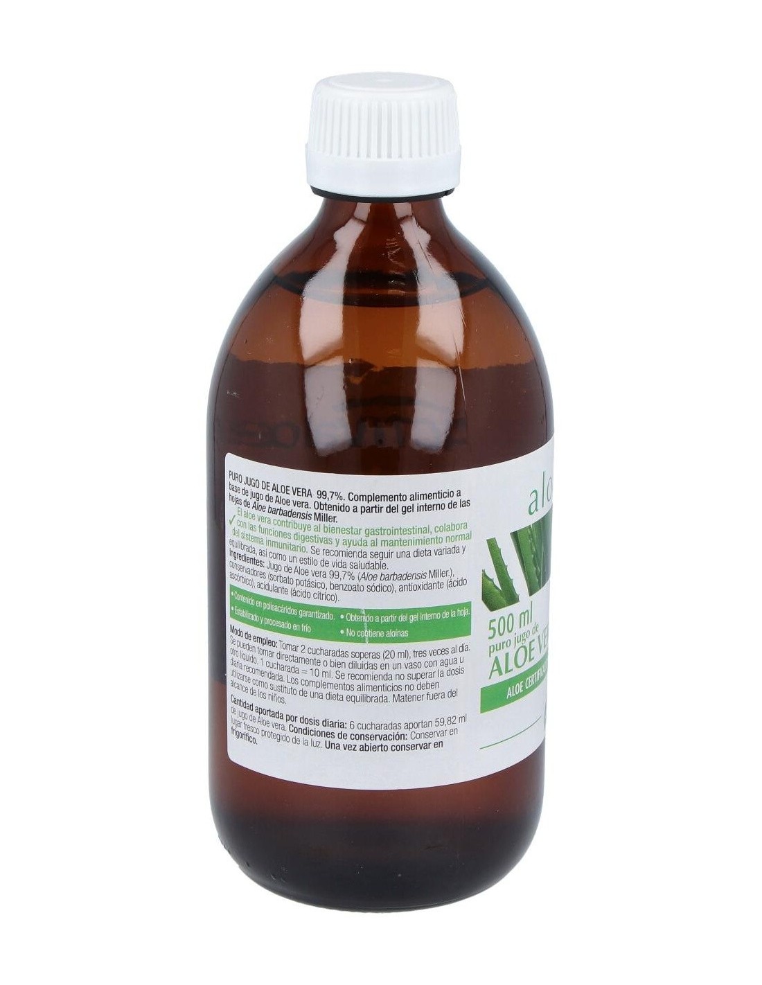 Jugo de Aloe vera L. 99,7% (Aloe barbadensis Miller), conservadores (sorbato potásico, benzoato sódico), antioxidante (ácido ascórbico), acidulante (ácido cítrico).