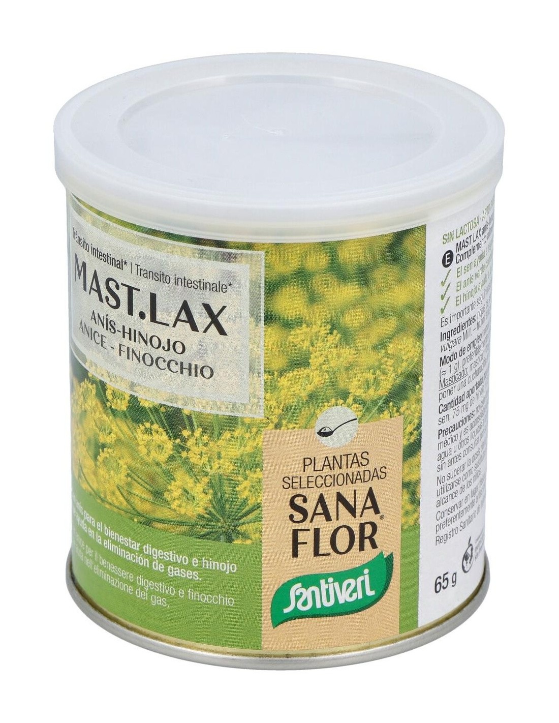 Santiveri Sanaflor Bote Mast-Lax Gases 65gr es un complemento alimenticio diseñado para estimular el tránsito intestinal y proteger la flora bacteriana.Colabora en los problemas gástricos.