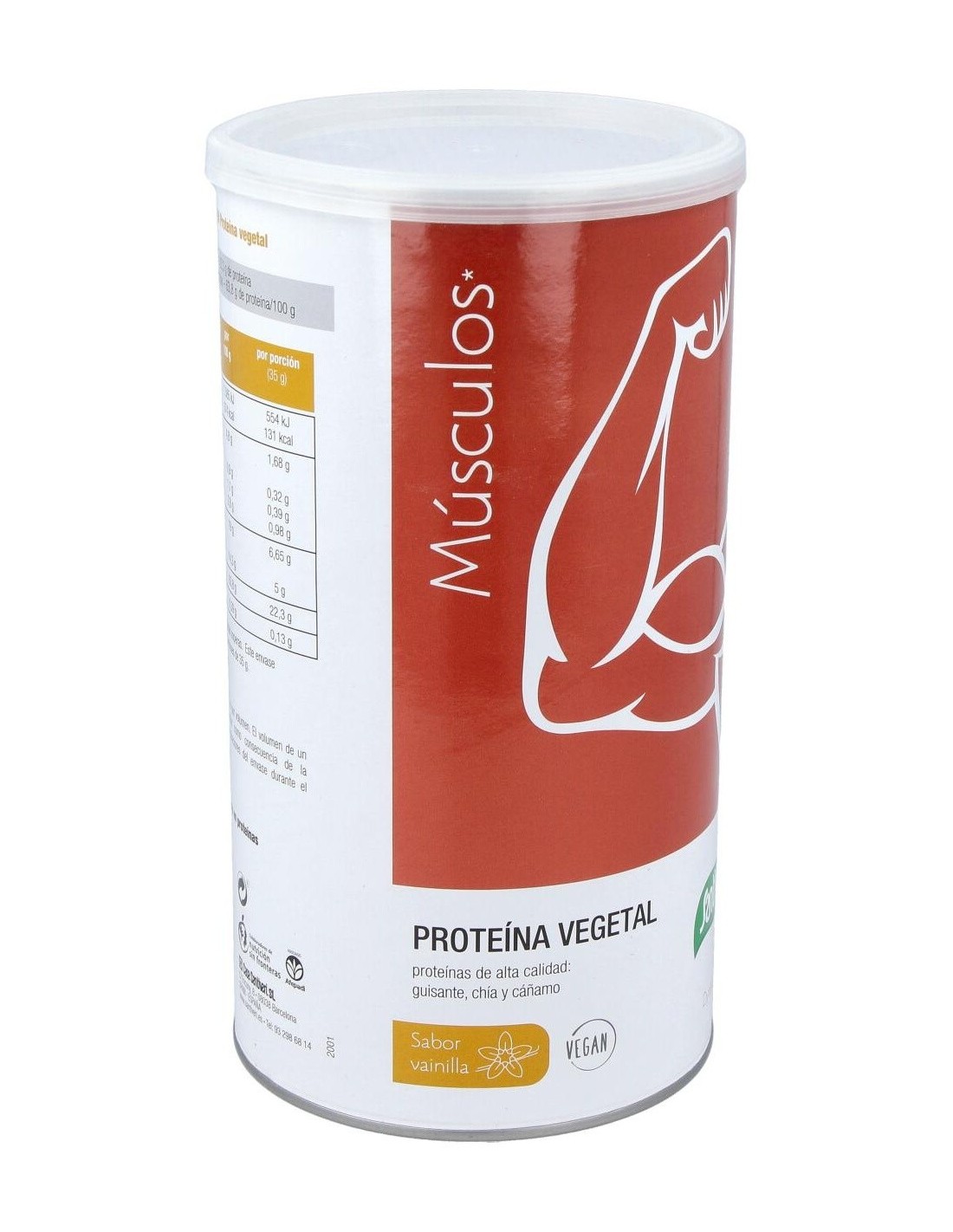 76% aislado de proteína de guisante amarillo (80% proteína), fructosa, 3% polvo de semillas de chía parcialmente desgrasado (40% proteína), aroma natural de vainilla, 2% proteína de semillas de cáñamo (68% proteína), dióxido de silicio (antiaglomerante), goma guar (espesante), glucósidos de esteviol (edulcorante).