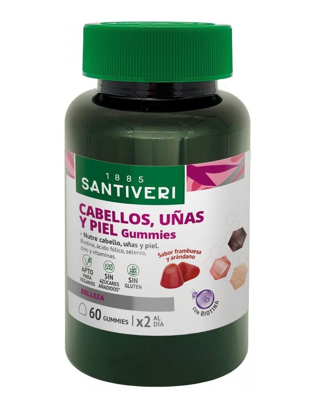 SANTIVERIComplemento alimenticio con Biotina, vitaminas y minerales de apoyo a cabellos, uñas y piel. Vitamina A, biotina, zinc y yodo ayudan a mantener la piel en condiciones normales. Biotina, zinc y selenio contribuyen a mantener el cabello en condiciones normales. Zinc y selenio ayudan a mantener las uñas en condiciones normales. Vitamina E, C, zinc y yodo ofrecen protección frente a la oxidación. Vitamina C contribuye a la formación normal de colágeno para el normal estado de la piel. Formato gummies masticables con sabor a frambuesa y arándano. Sin azúcares añadidos, gluten ni lactosa. Apto para veganos.