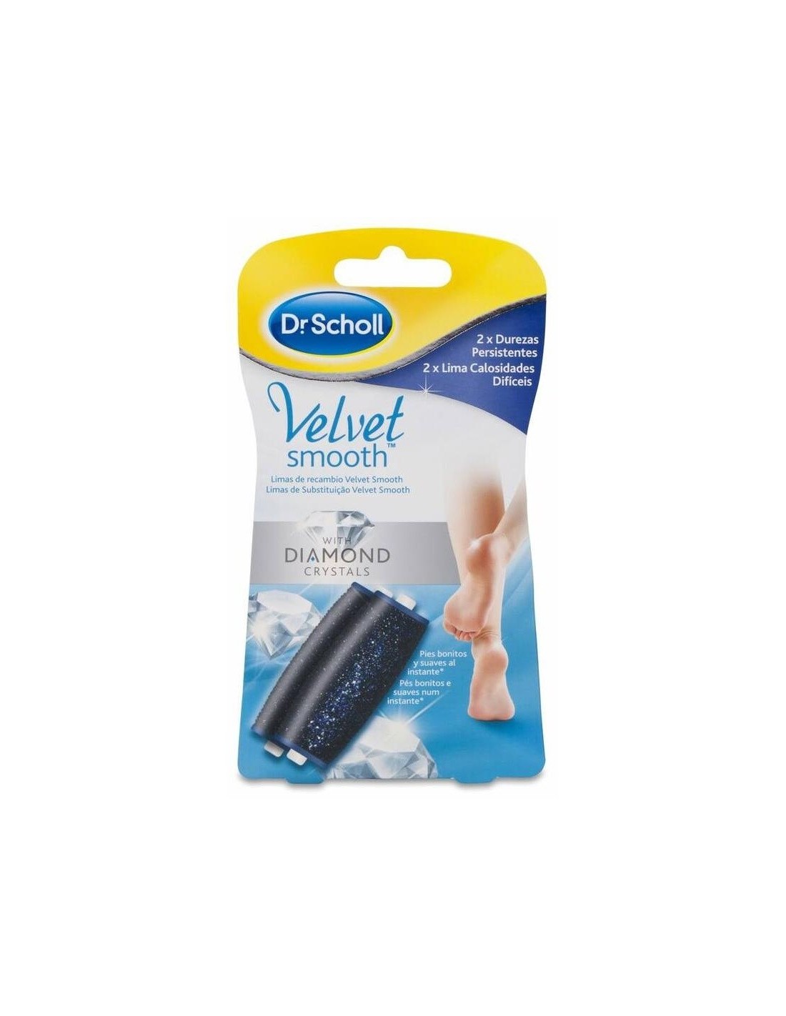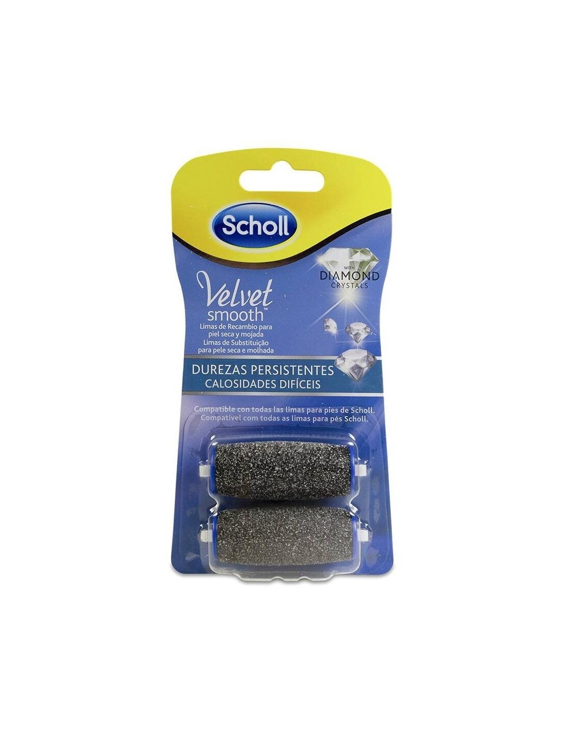 El recambio de limas Scholl Velvet Smooth Diamonds Crystals para durezas persistentes es un pack de dos cabezales que ayudan a exfoliar la piel y le dan a tus pies el aspecto que necesitan gracias a su composición en macropartículas de microalumina.