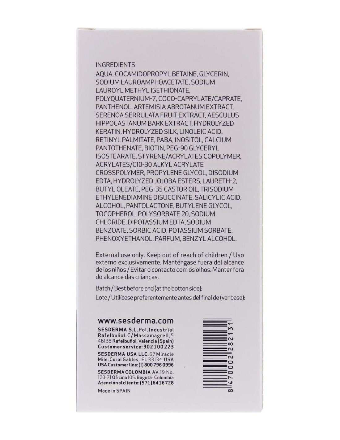 El Extracto de Artemisa favorece la microcirculación y el aporte de nutrientes. La Serenoa Serrulata inhibe el efecto de la 5-a-reductasa, enzima responsable del acortamiento del ciclo capilar. Con activos hidratantes y reparadores como la Keratina, Seda y Jojoba, que protegen la fibra capilar del daño del cepillado. Estimulantes del crecimiento como la Cafeína, el Zinc y el Mentol activan la circulación y mejoran la función del sistema inmunológico.
