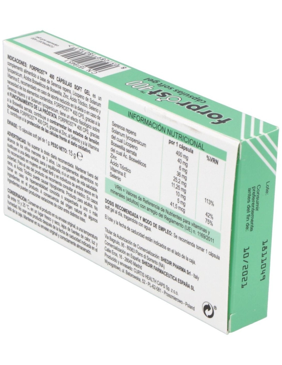 Extracto lípidico-esterólico de fruto de Serenoa Repens. Gelatina alimenticia. Endurecedor: Glicerol. Aceite de semillas de Helianthus annuus L. (Girasol), Gluconato de Zinc, fruto 15% en Licopeno de Solanum lycopersicum (tomate), estracto seco de resina titulado al 70% en Ácidos Boswellic de Boswellia serrata Roxb. (Boswellia). Espesante: Cera de Abejas. Ácido Tióctico, Vitamina E (acetato de DL-alfa-tocoferilo). Espesante: Bióxido de Silicio. Colorantes: complejos cúpricos de clorofilas y clorofilinas, Dióxido de Titanio. Selenito de Sodio.