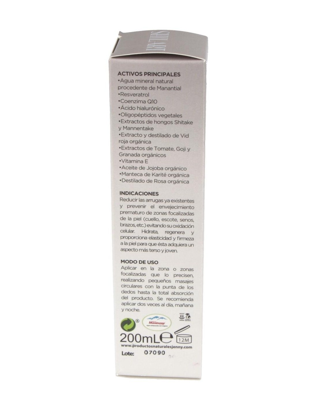 Agua mineral natural procedente de Manantial, Resveratrol, Coenzima Q10, Ácido hialurónico, oligopéptidos vegetales, extractos de hongos shitake y mannentake, extracto y destilado de vid roja orgánica, extractos de tomate, goji y granada orgánicos, vitamina E, aceite de jojoba orgánico, manteca de Karité orgánica y destilado de Rosa orgánica.
