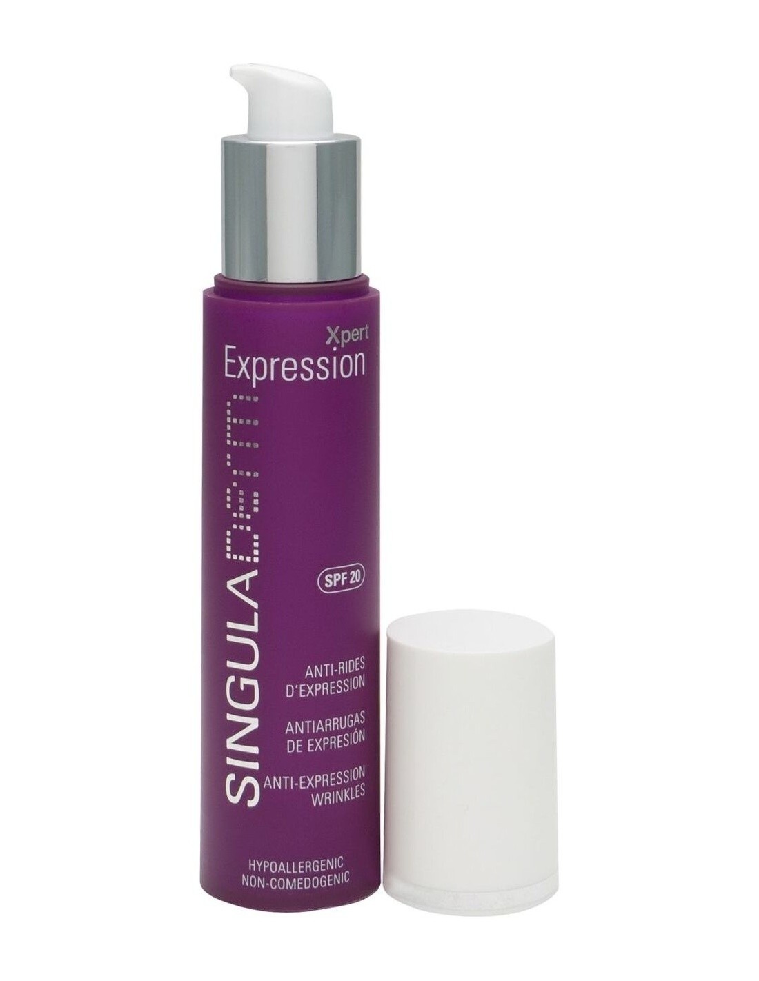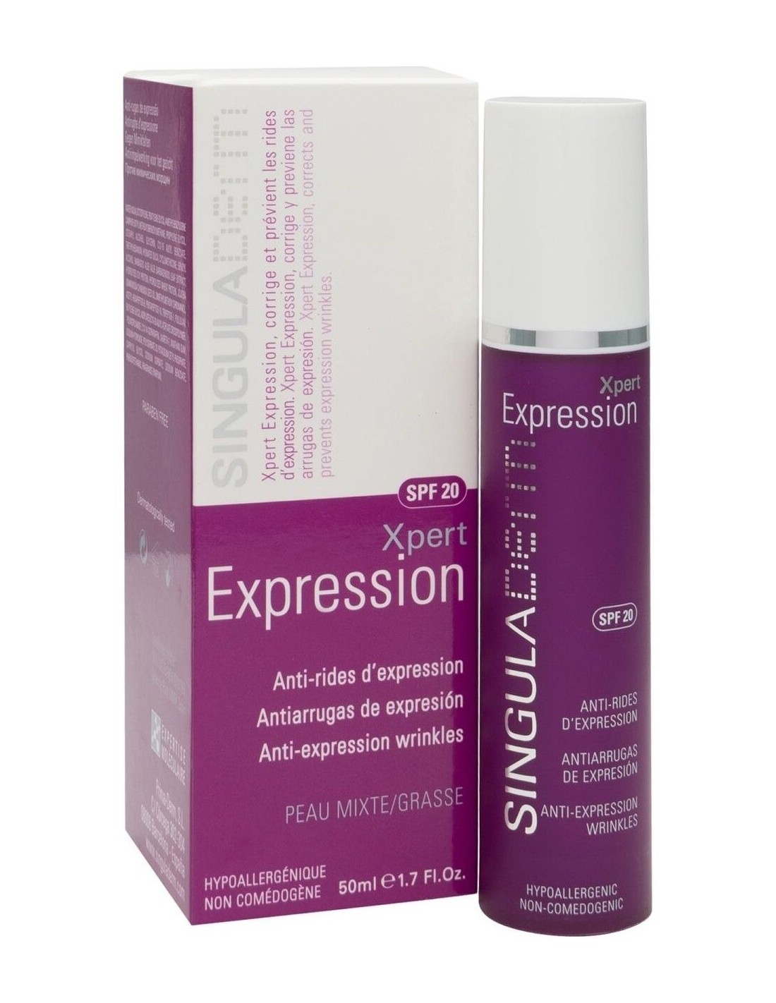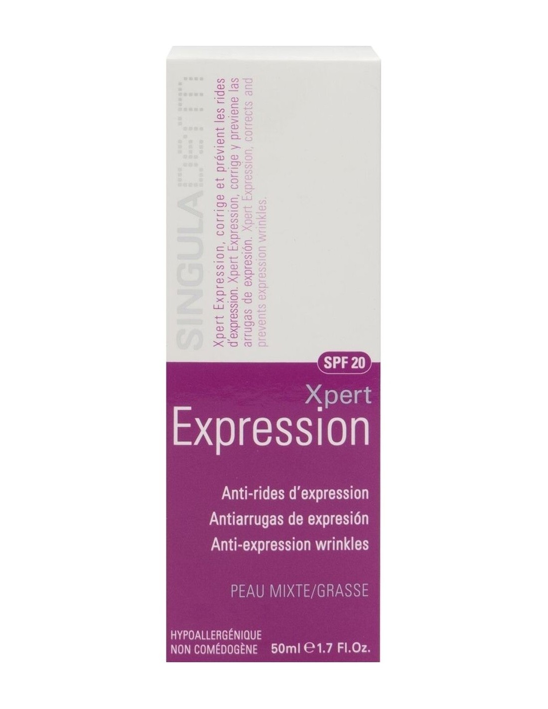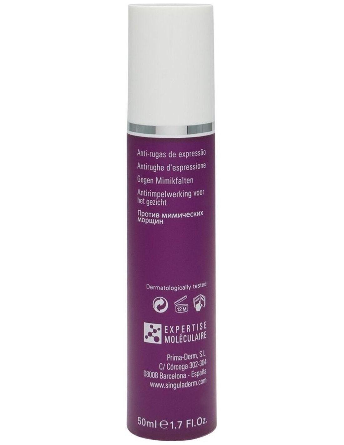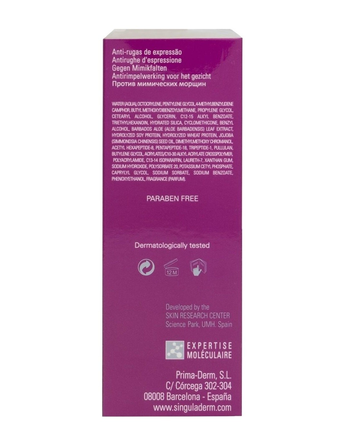 SINGULADERMCrema hidratante antiedad especialmente diseñada para corregir y prevenir las arrugas de expresión. Actúa doblemente sobre las arrugas de expresión además de prevenir las arrugas metabólicas y fotoinducidas. El efecto antiradicales libres de su exclusiva fórmula con péptidos biomiméticos protege la piel de los factores intrínsecos y extrínsecos que causan el envejecimiento, manteniéndola joven más tiempo. Puede usarse como alternativa tópica a las inyecciones de toxina botulínica o como complemento a las mismas, con resultados clínicamente probados. Potencia los resultados antiarrugas de expresión con nuestro sérum XPERT Sublime. Piel mixta/grasa. Hipoalergénico. Testado dermatológicamente.