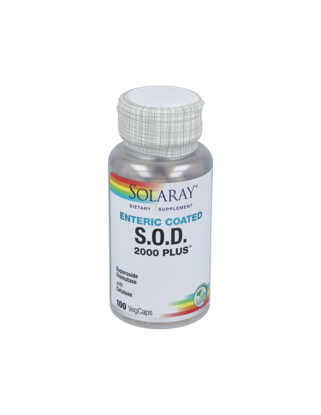 S.O.D complex: superóxido dismutasa (2.000 unidades McCord Fridovich, que aporta de forma natural glutation peroxidasas), catalasa, maltodextrina, cápsula de celulosa vegetal, agente de carga: celulosa.