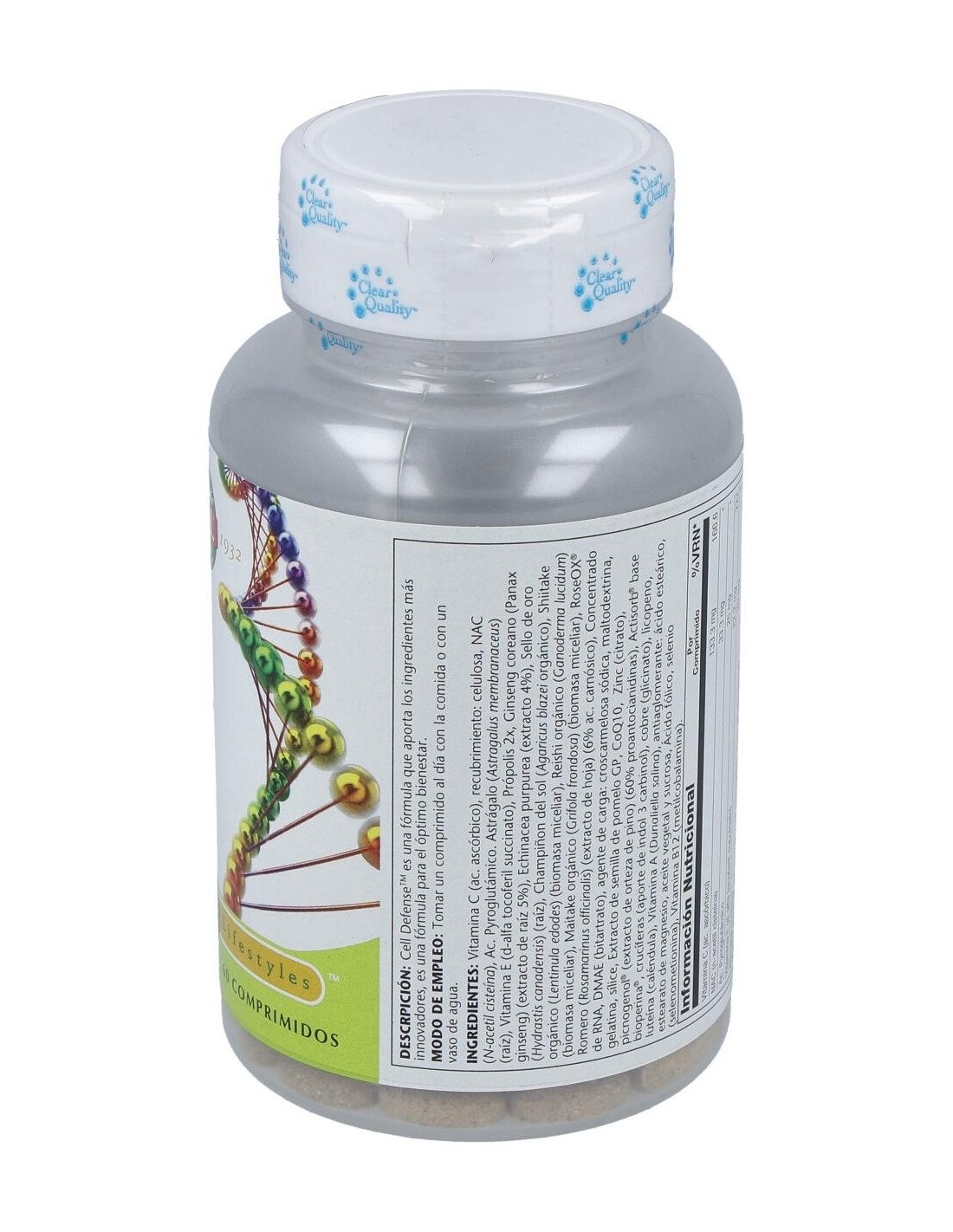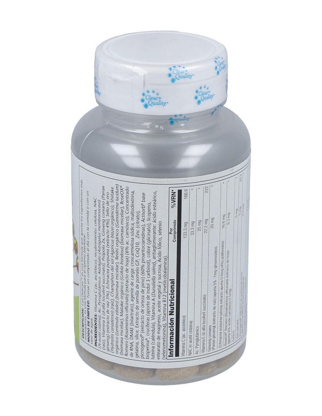 champiñón del sol órganico (Agaricus Blazei), shiitake orgánico (Lentinula edodes)(biomasa micelar), reishi orgánico (Ganoderma lucidum) (biomasa micelar), roseOX® Romero ( Rosmarinis officinalis)(extracto de hoja) concentrado de ARN, DMAE (bitartrato): agente de carga:croscarmelosa sódica, maltodextrina, gelatina, sílice, extracto de semilla de pomelo GP, CoQ10, zinc(citrato), pycnogenol ® (extracto de corteza de pino), Actisorb ® base de bioperina®, crucíferas (aporte de indol-3-carbinol), cobre (glicinato), licopeno, luteína (caléndula), vitamina A (Dunaliella salina):antiaglomerante: ácido esteárico, estearato de magnesio, aceite vegetal, sucrosa, ácido fólico, selenio (L-selenometionina), vitamina B12 ( metilcobalamina).