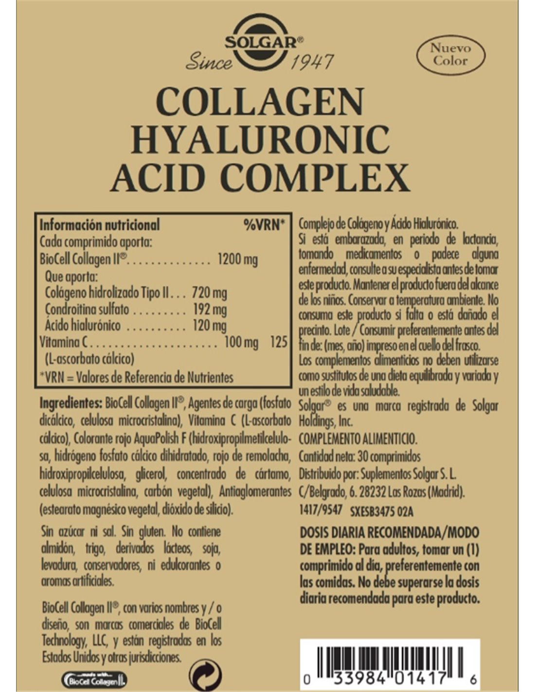 Ácido Hialurónico Complex con Colágeno 30 comprimidos Solgar