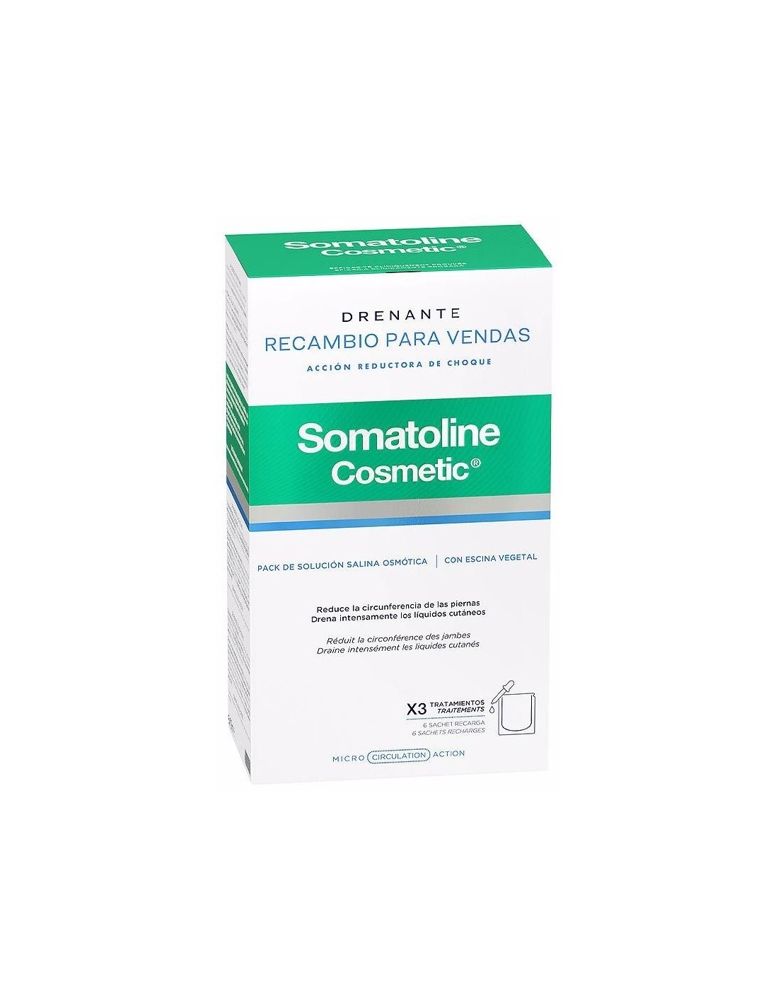 SOMATOLINELa solución salina osmótica concentrada de principios activos con eficacia drenante intensiva para recargar las Vendas Drenantes Somatoline Cosmetic, 3 tratamientos. Ideal para pieles con tendencia a la retención de líquidos y grasa localizada en la zona de las piernas, de los muslos y de los glúteos, para un efecto drenante de choque.