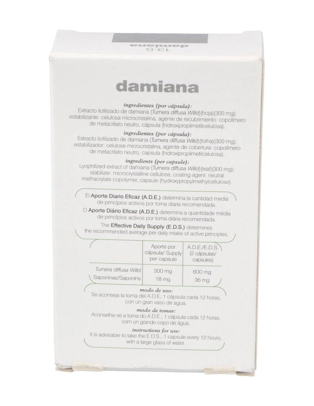 Extracto liofilizado de damiana (Turnera diffusa Willd) (hoja) (300 mg) : estabilizante: celulosa microcristalina, agente de recubrimiento: copolímero de metacrilato neutro, cápsula (hidroxipropilmetilcelulosa).