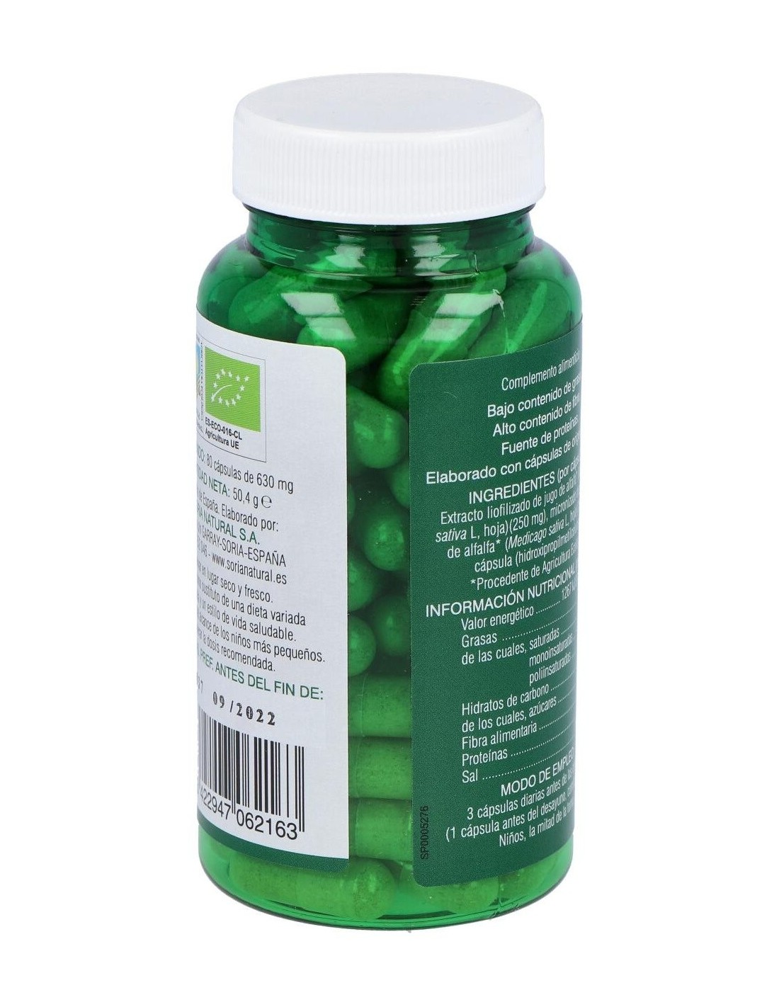 Composición activa por cápsula: 250 mg de extracto liofilizado de jugo de alfalfa. 250 mg de micronizado deshidratado de alfalfa.