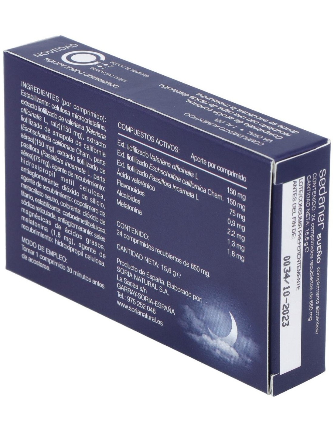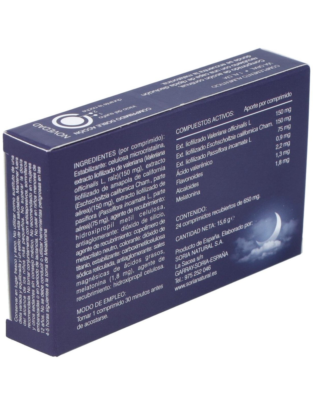 Estabilizante: celulosa microcristalina, extracto liofilizado de valeriana (Valeriana officinalis L, raíz) (150 mg), extracto liofilizado de amapola de california (Eschscholtzia californica Cham., parte aérea) (150 mg), extracto liofilizado de pasiflora (Passiflora incarnata L, parte aérea) (75 mg), agente de recubrimiento: hidroxipropil metil celulosa, antiaglomerante: dióxido de silicio, agente de recubrimiento: copolímero de metacrilato neutro, colorante: dióxido de titanio, estabilizante: carboximetilcelulosa sódica reticulada, antiaglomerante: sales magnésicas de ácidos grasos, melatonina (1,8 mg), agente de recubrimiento: hidroxipropil celulosa.
