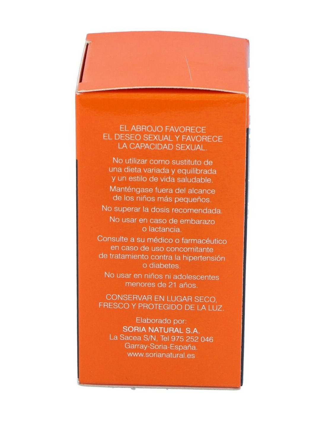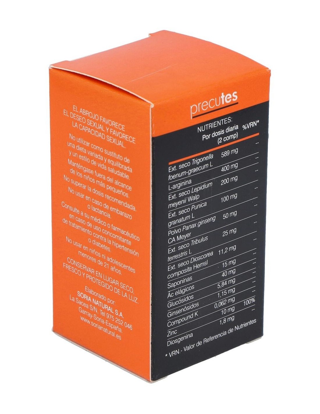 Extracto seco de alholva (Trigonella foenum-graecum L, semillas) (294,5 mg), L-arginina HCI, estabilizante: celulosa microcristalina, extracto seco de maca (Lepidium meyenii Walp, raíz) (100 mg), extracto seco de granada (Punica granatum L, cáscara de fruto) (50 mg), polvo de ginseng negro fermentado (cultivado en Soria) (Panax ginseng CA Meyer, raíz) (25 mg), picolinato de zinc, antiaglomerante: dióxido de silicio., extracto seco de abrojo (Tribulus terrestris L, fruto) (12,5 mg), estabilizante: carboximetilcelulosa sódica reticulada, antiaglomerante: sale magnésicas de ácidos grasos, extracto seco de Dioscorea composita (Dioscorea composita Hemsl, raíz) (5,6 mg).