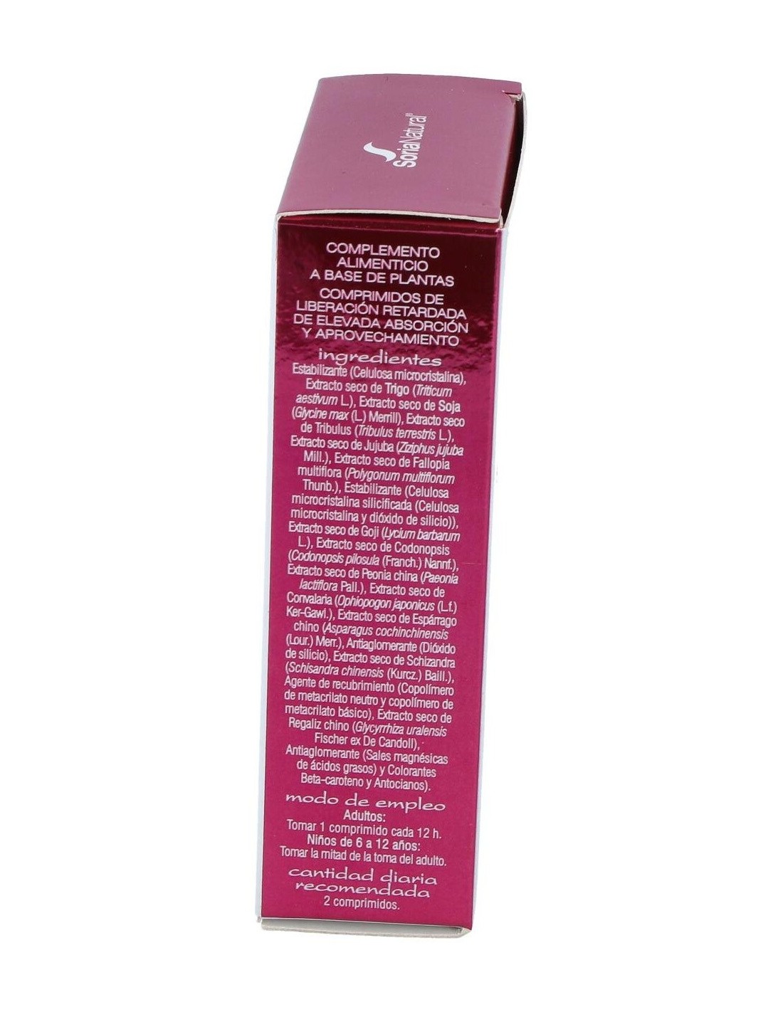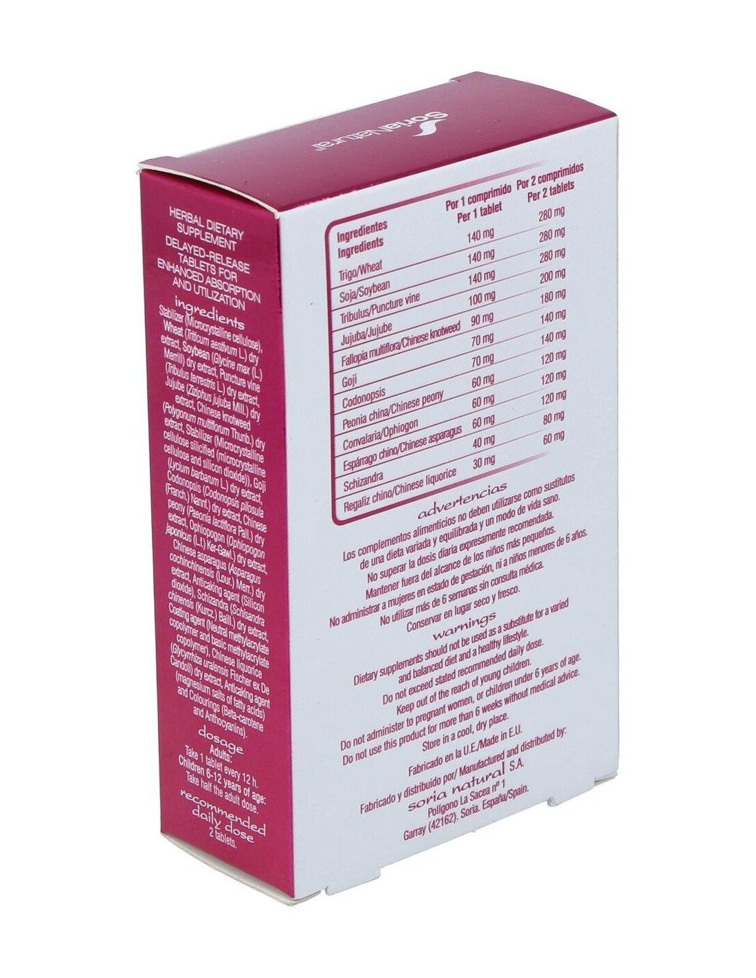 Estabilizante (Celulosa microcristalina), Extracto seco de Trigo (Triticum aestivum L.), Extracto seco de Soja (Glycine max (L.) Merrill), Extracto seco de Tribulus (Tribulus terrestris L.), Extracto seco de Jujuba (Ziziphus jujuba Mill.), Extracto seco de Fallopia multiflora (Polygonum multiflorum Thunb.), Extracto seco de Goji (Lycium barbarum L.), Extracto seco de Codonopsis (Codonopsis pilosula (Franch.) Nannf.), Estabilizante (Hidroxipropilcelulosa), Extracto seco de Peonia china (Paeonia lactiflora Pall.), Extracto seco de Convalaria (Ophiopogon japonicus (L.f.) Ker-Gawl.), Extracto seco de Espárrago chino (Asparagus cochinchinensis (Lour.) Merr.), Extracto seco de Schizandra (Schisandra chinensis (Kurcz.) Baill.), Antiaglomerante (Dióxido de silicio), Extracto seco de Regaliz chino (Glycyrrhiza uralensis Fischer ex De Candoll), Agente de recubrimiento (Copolímero neutro), Antiaglomerante (Estearato de magnesio) y Colorantes (Beta-caroteno y Antocianos).