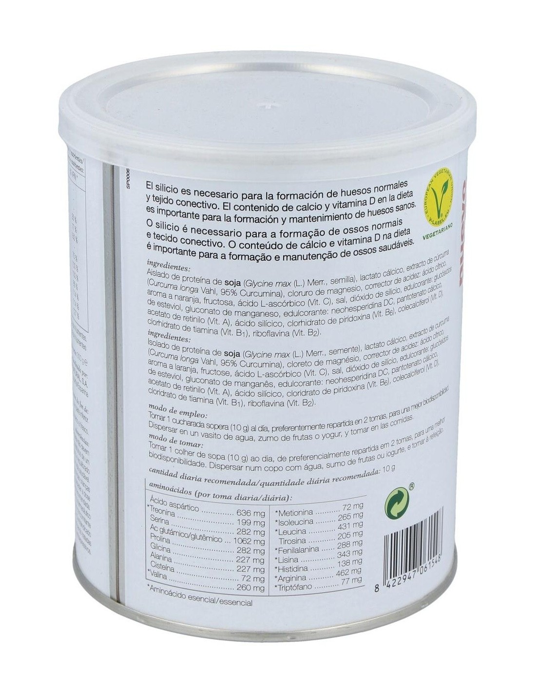 Aminoácidos de origen vegetal (soja), Lactato de calcio, Extracto de Cúrcuma (Curcuma longa L. 95% Curcumina), Cloruro de magnesio, Acidulante (Ácido cítrico), Aroma de naranja, Edulcorante (Acesulfamo de potasio), Vitamina C (Ácido L-ascórbico), Cloruro sódico, Fructosa, Antiaglomerante (Dióxido de silicio), Gluconato de manganeso, Vitamina B5 (D-Pantotenato de calcio), Vitamina A (Acetato de retinol), Ácido silícico, Edulcorante (Neohesperidina DC), Vitamina D (Colecalciferol), Vitamina B6 (Cloridrato de piridoxina), Vitamina B1 (Clorhidrato de tiamina) y vitamina B2 (Riboflavina).