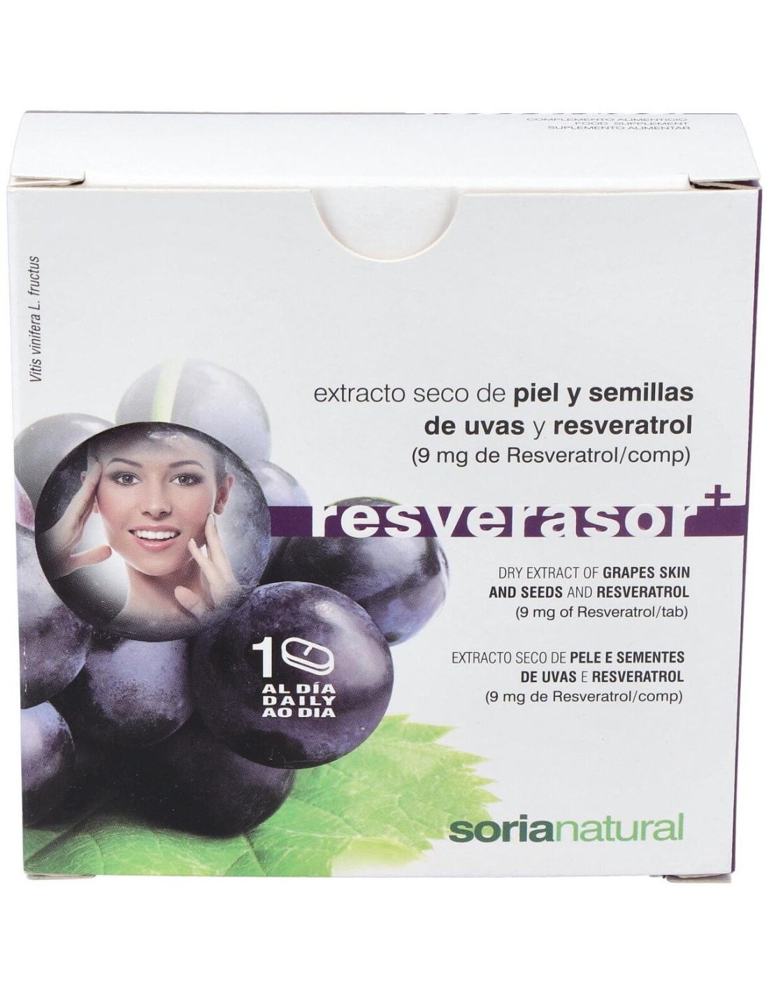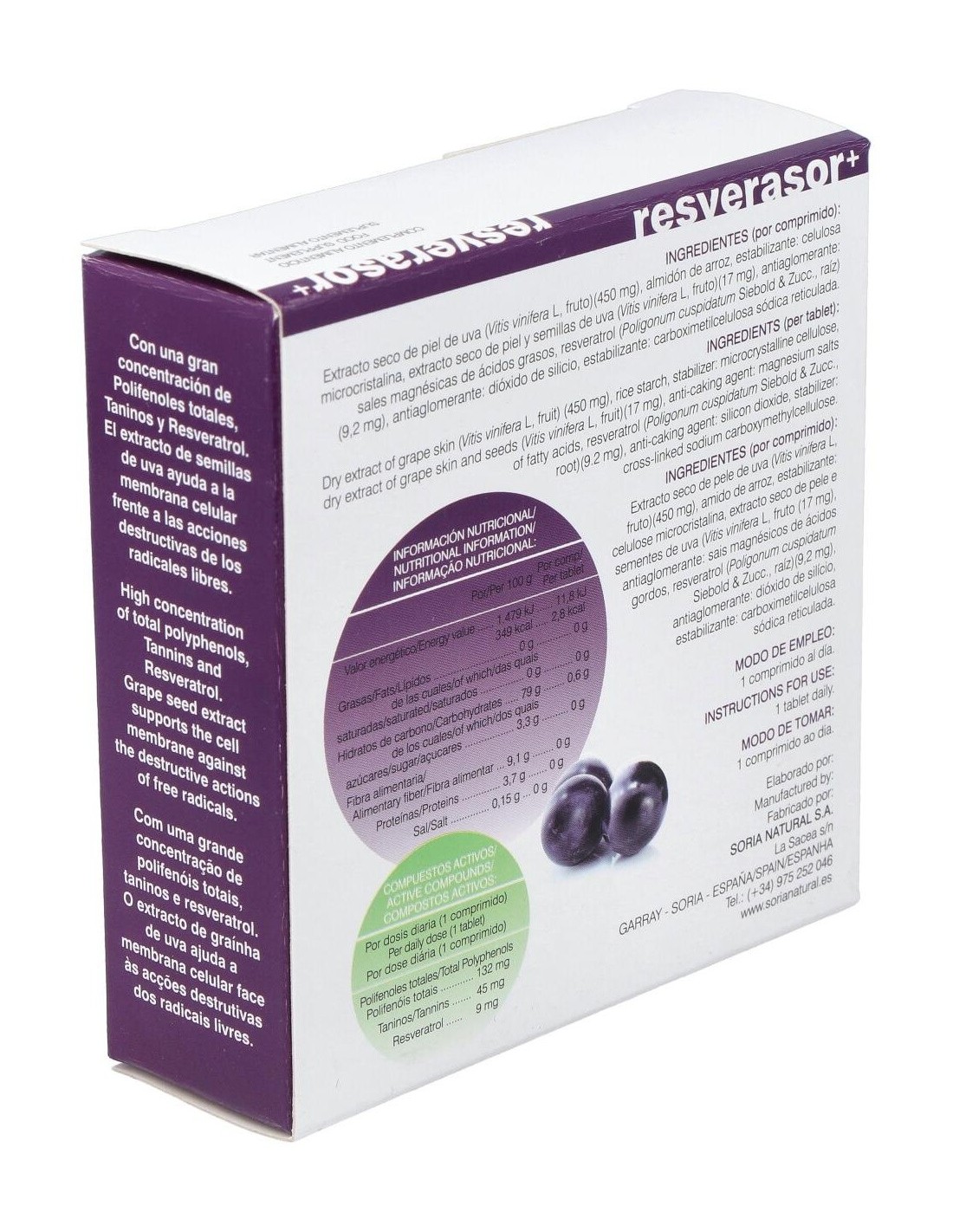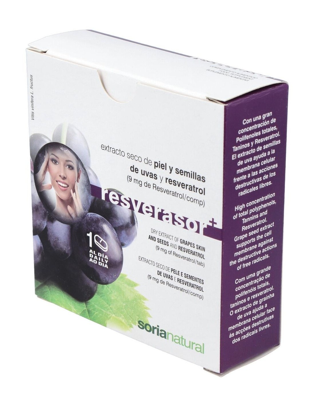 Soria Natural te presenta Resverasor Plus, unos comprimidos realizados a base de semillas y piel de uvas negras procedentes de cultivo ecológico. Esta fruta te ofrece una acción antioxidante y antienvejecimiento.