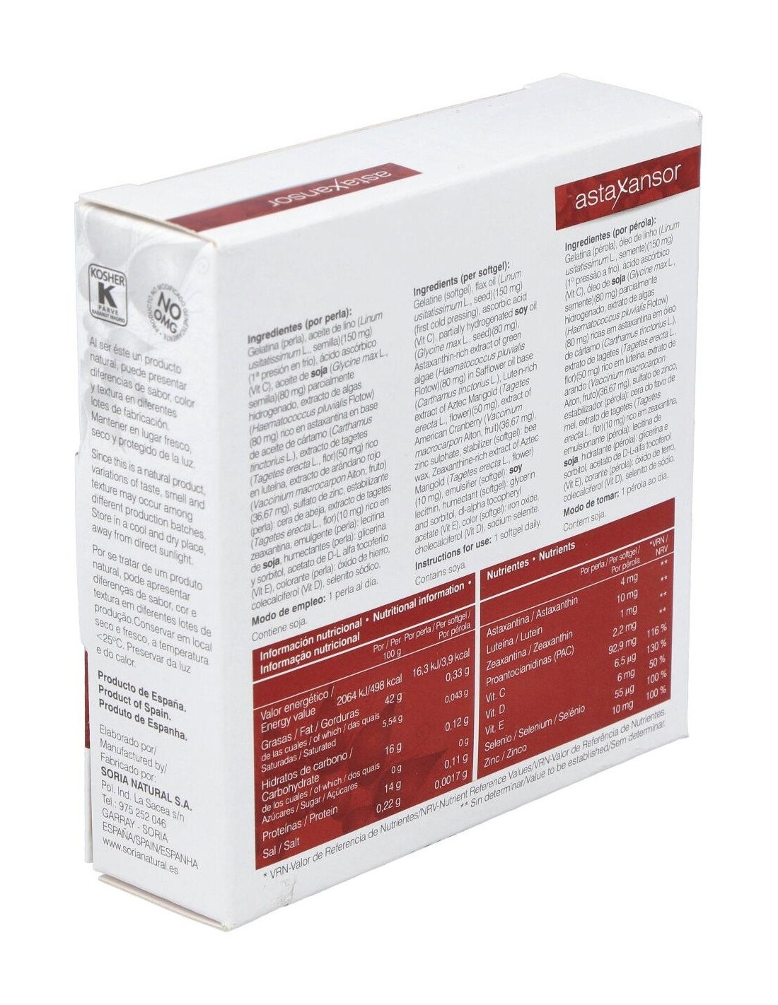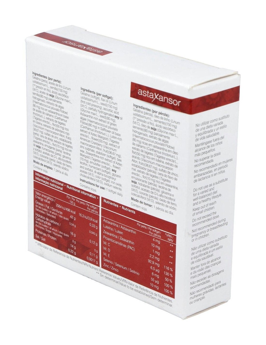 ACEITE DE SEMILLAS DE LINO (1ª PRESIÓN EN FRÍO), GELATINA, VITAMINA C, ACEITE DE SOJA (PARCIALMENTE HIDROGENADA), ACEITE DE CÁRTAMO, EXTRACTO DE ALGAS (HAEMATOCOCCUS PLUVIALIS) RICO EN ASTAXANTINA, HUMECTANTE: GLICERINA, SULFATO DE ZINC, HUMECTANTE: SORBITOL, EXTRACTO DE ARÁNDANO ROJO (25:1), ACETATO DE D-L ALFA TOCOFERILO, ESTABILIZANTE: CERA DE ABEJA, LUTEÍNA NATURAL Y ZEAXANTINA NATURAL (TAGETES ERECTA), COLECALCIFEROL, SELENITO SÓDICO, EMULSIONANTE: LECITINA DE SOJA, COLORANTE: ÓXIDO E HIDRÓXIDO DE HIERRO.