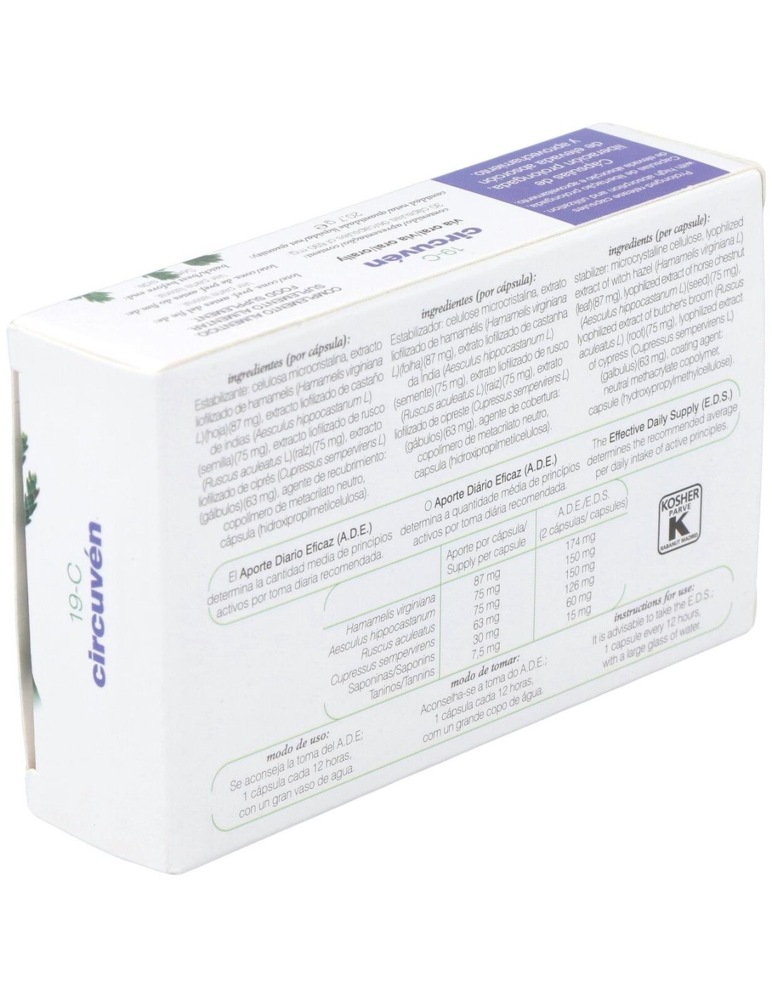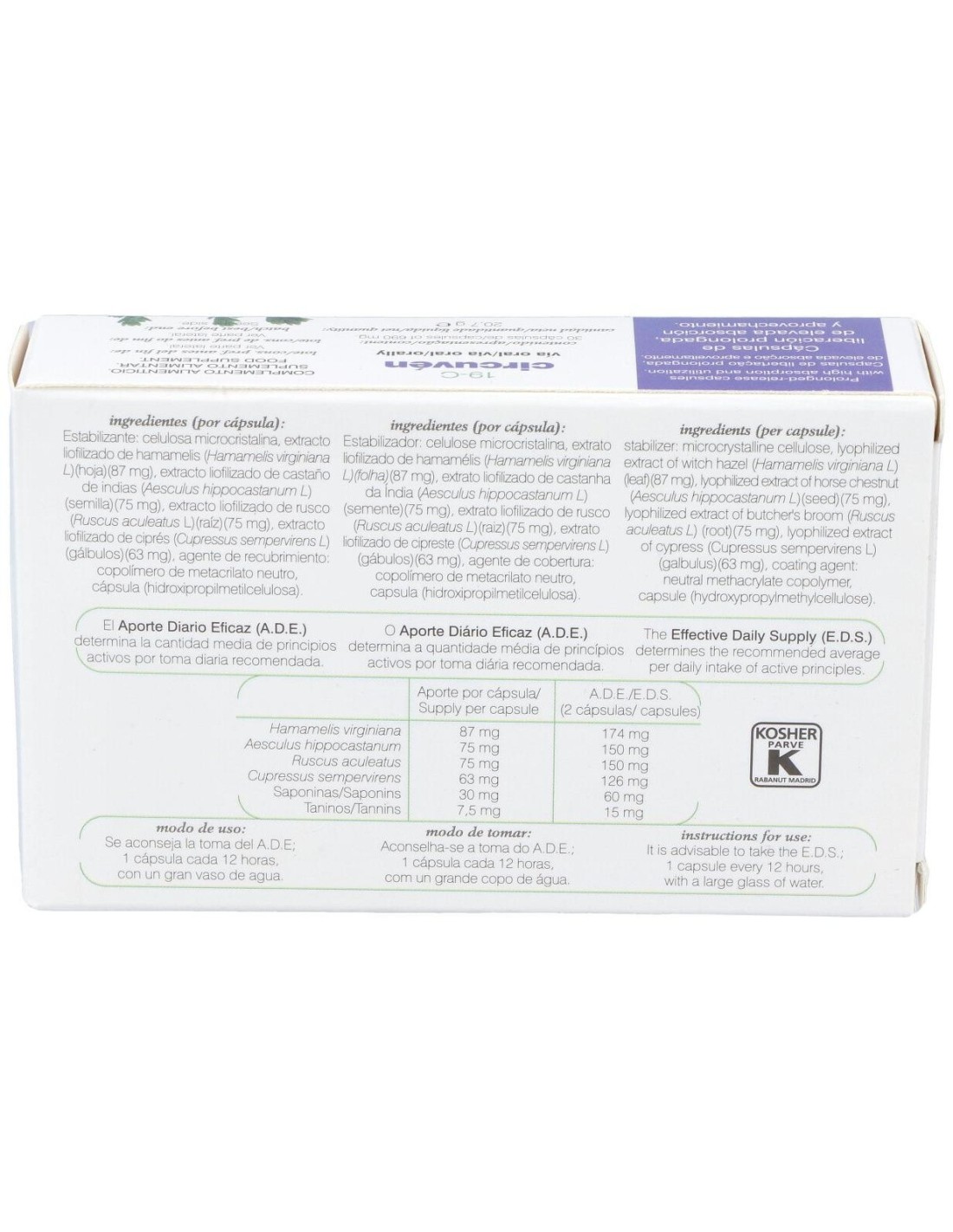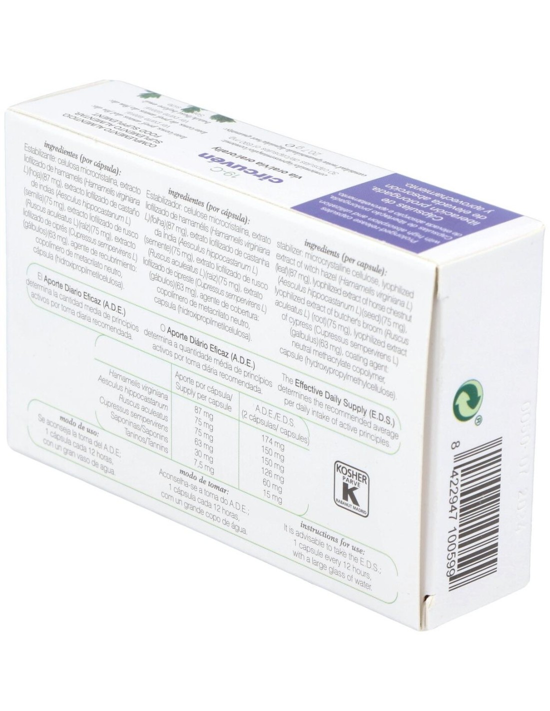 Extracto liofilizado de hamamelis (Hamamelis virginiana L) (hoja)(87 mg), extracto liofilizado de castaño de indias (Aesculus hippocastanum L) (semilla)(75 mg), extracto liofilizado de rusco (Ruscus aculeatus L) (raíz)(75 mg), extracto liofilizado de ciprés (Cupressus sempervirens L) (gálbulos)(63 mg), estabilizante: celulosa microcristalina: agente de recubrimiento: copolímero de metacrilato neutro, cápsula (hidroxipropilmetilcelulosa).