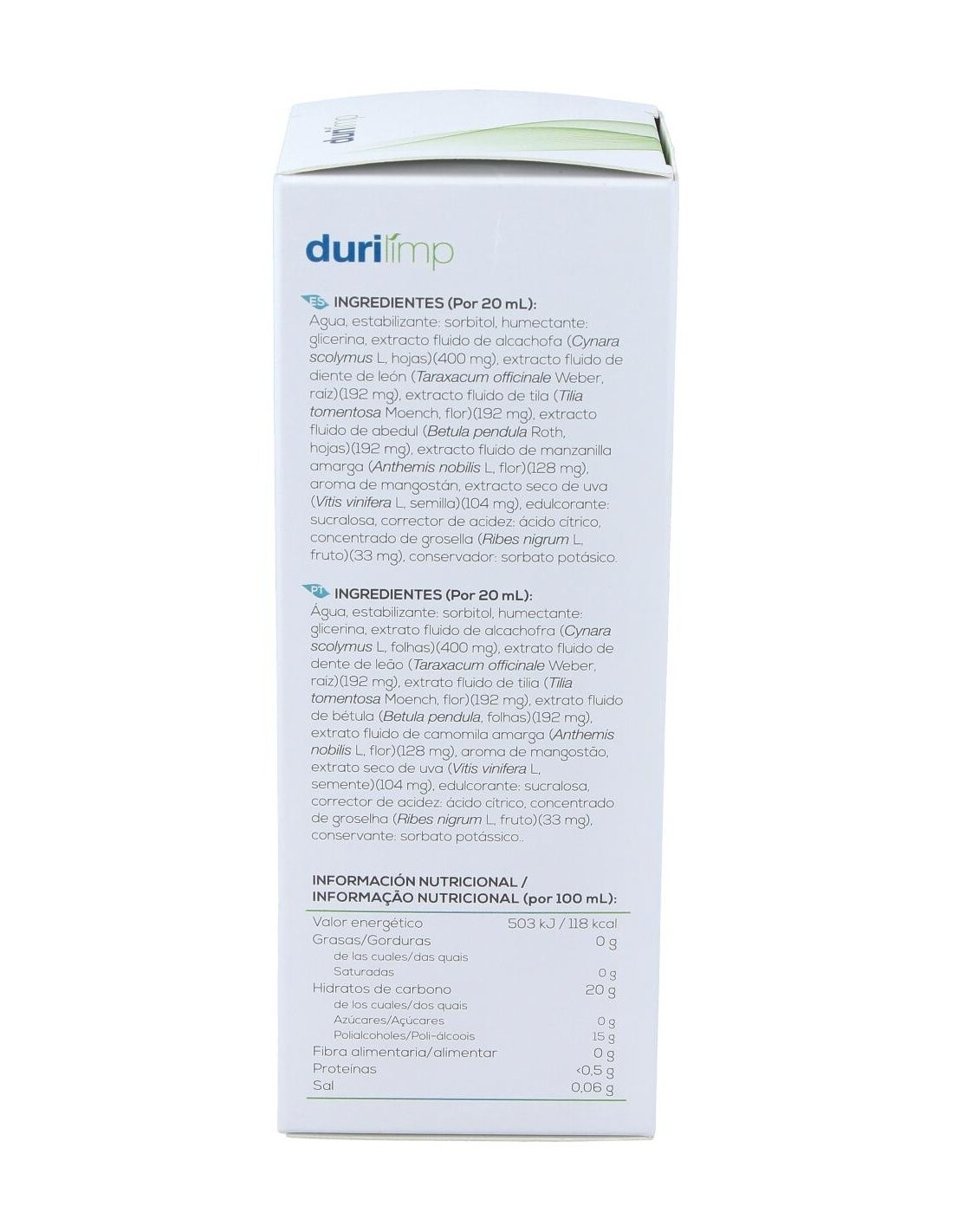 Agua, humectante: glicerina, edulcorante: sorbitol, aroma de mangostán, uva (Vitis vinifera L), alcachofa (Cynara scolymus L), regulador de acidez: ácido cítrico, diente de león (Taraxacum officinale F.H. Wigg), tila (Tilia platyphyllos Scop), abedul (Betula alba L), manzanilla amarga (Anthemis nobilis L), edulcorante: sucralosa, concentrado de arándano (Vaccinium myrtillus L) y grosellero (Ribes nigrum L), conservante: sorbato potásico.