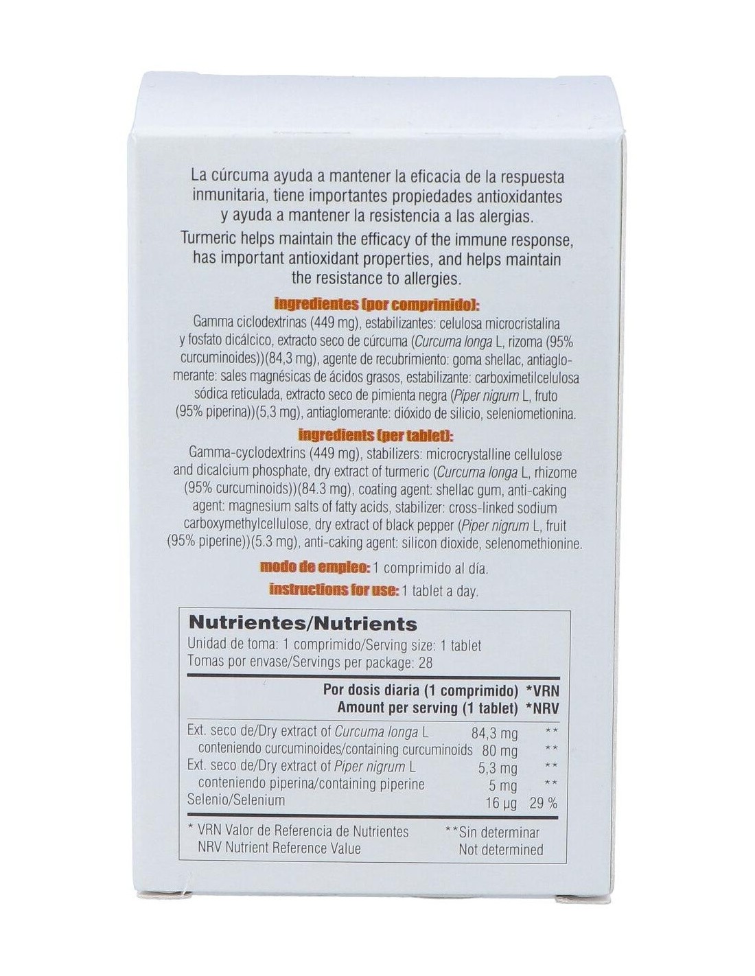 La cúrcuma ayuda a mantener la eficacia de la respuesta inmunitaria, tiene importantes propiedades antioxidantes y ayuda a mantener la resistencia a las alergias. CURCUDEXTRIN 28comp.