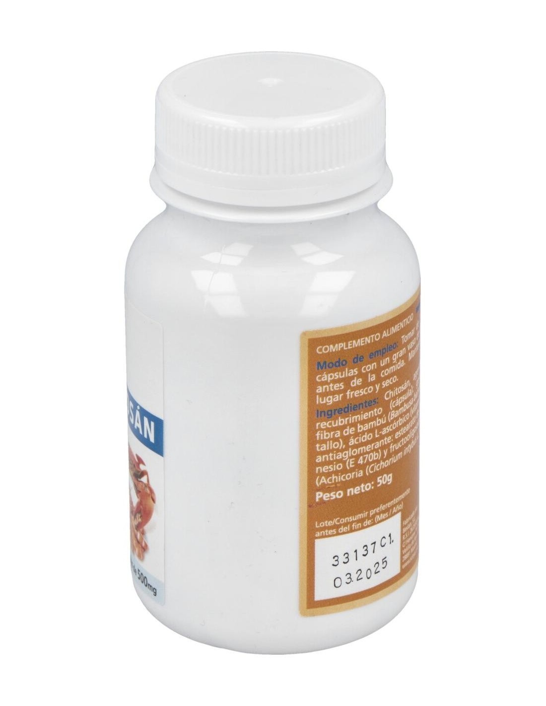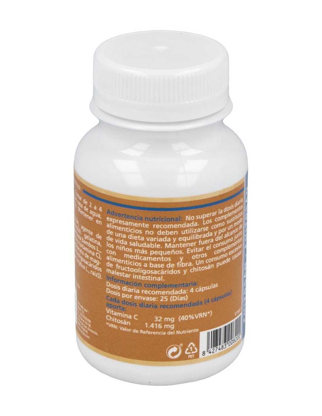 100 cápsulas de 500mg con 335mg de chitosán y 7mg de vitamina C (14.5% CDR), cápsula de gelatina (100mg) y excipientes.