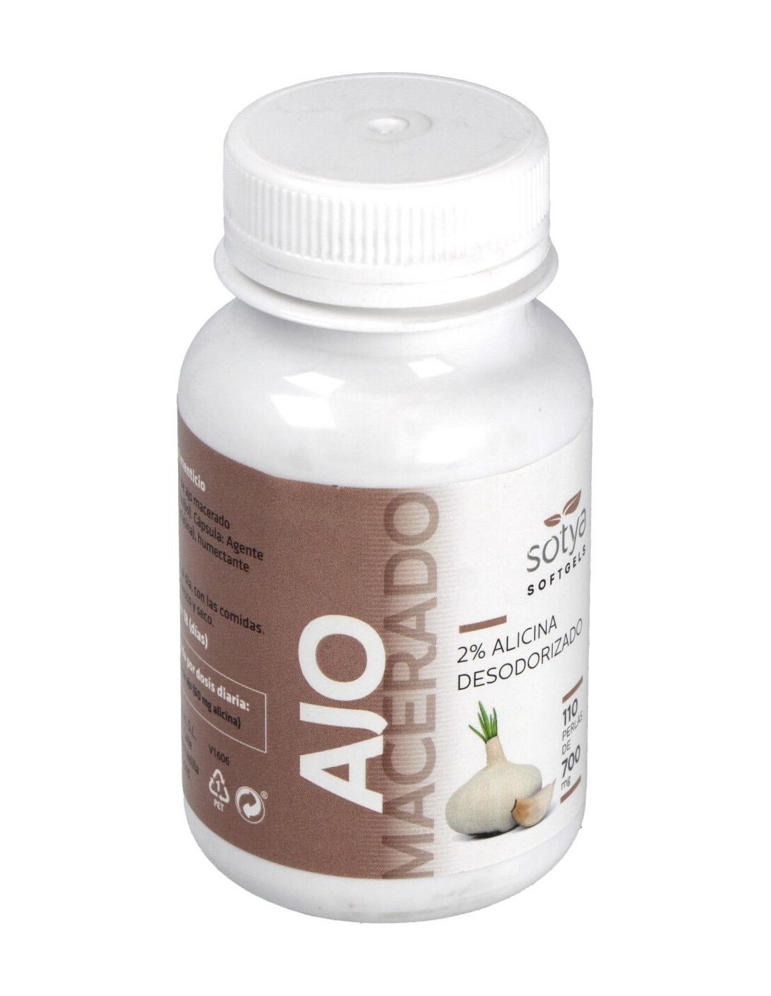 Sotya Ajo Macerado son unas perlas concentradas de aceite macerado de ajo que te ayudarán a disfrutar de todos los beneficios de este activo vegetal. Cada perla contiene 500mg de aceite macerado de ajo.