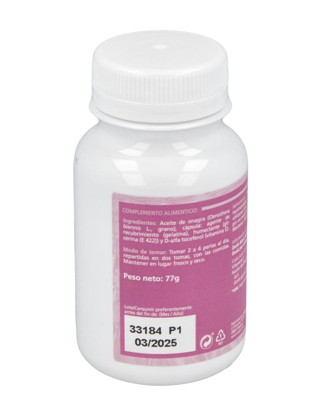 Perlas de 503mg: 110, 220 y 450 perlas con 500mg de aceite de onagra de primera presión en frío con 10% GLA, 2.5mg de vitamina E natural, d-alfa tocoferol acetato (25% CDR). Cobertura de gelatina y glicerina. Peso total aproximado 640mg (incluida cobertura).