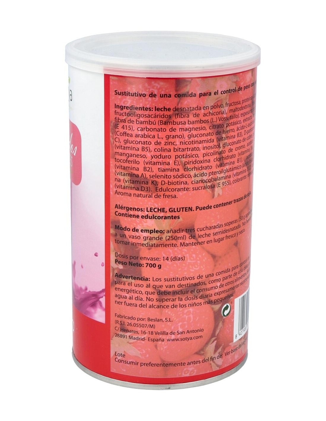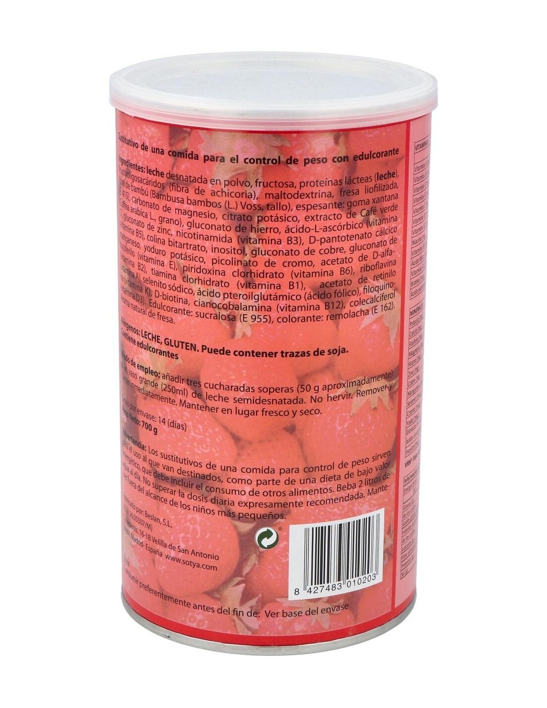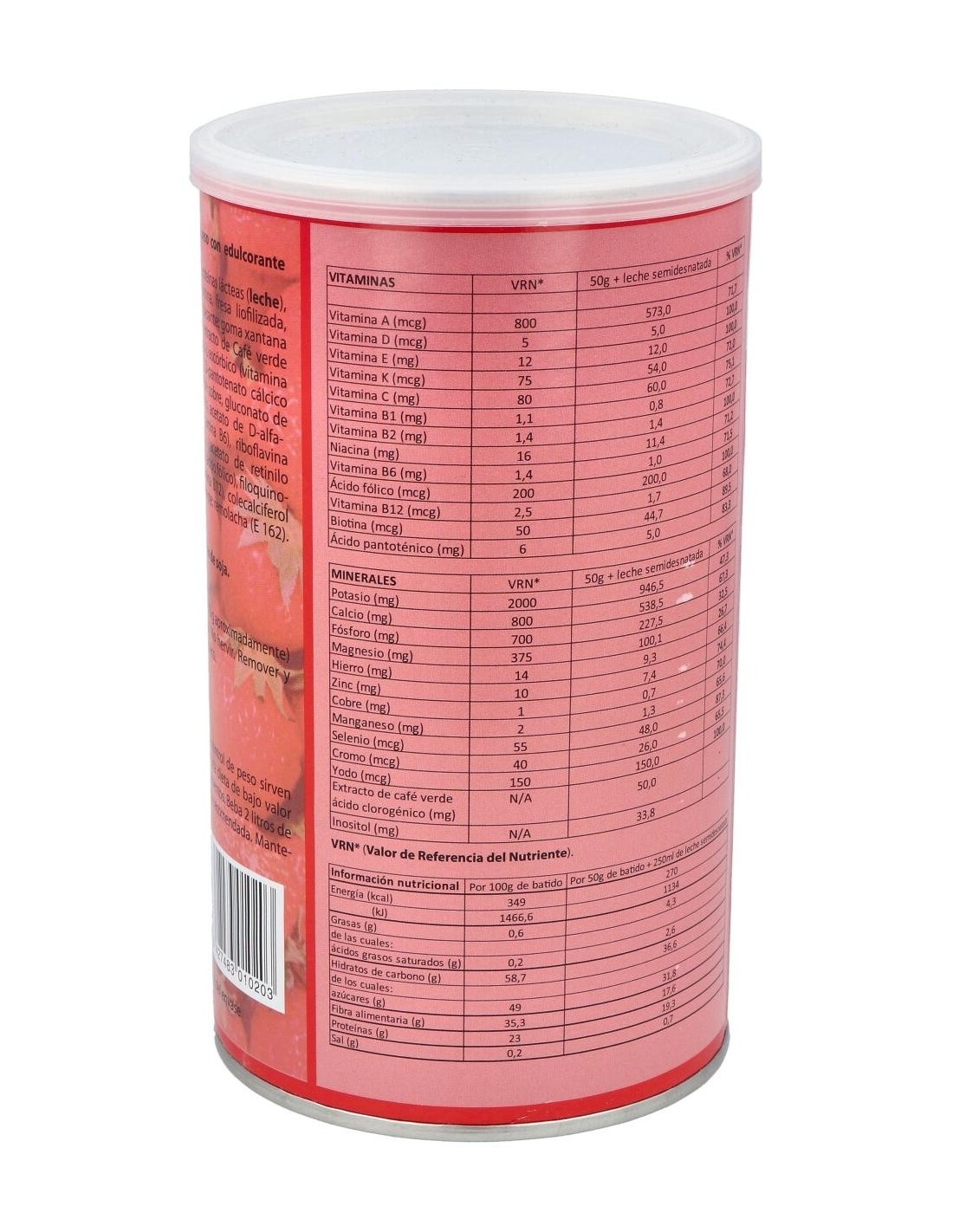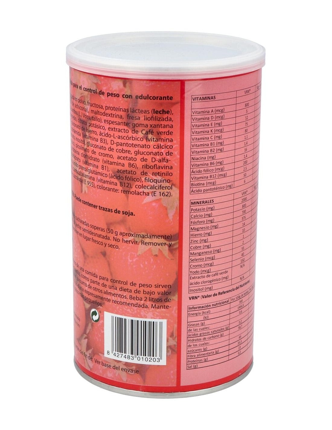 Leche desnatada en polvo, fructosa, proteínas lácteas (leche), fructooligosacáridos (fibra de achicoria), maltodextrina, fresa liofilizada, fibra de bambú (Bambusa bambos (L.) Voss, tallo), espesante: goma xantana (E415), carbonato de magnesio, citrato potásico, extracto café verde (Coffea arabica L., grano), gluconato de hierro, ácido L-ascórbico (vitamina C), gluconato de zinc, nicotinamida (vitamina B3), D-pantotenato cálcico (vitamina B5), colina bitartrato, inositol, gluconato de cobre, gluconato de manganeso, yoduro potásico, picolinato de cromo, acetato de D-alfa tocoferilo (vitamina E), piridoxina clorhidrato (vitamina B6), riboflavina (vitamina B2), tiamina clorhidrato (vitamina B1), Acetato de retinilo (vitamina A), selenito sódico, ácido pteroilglutámico (ácido fólico), filoquinona (vitamina K), D-biotina, cianocobalamina (vitamina B12) y colecalciferol (vitamina D3). Edulcorante: sucralosa (E955). Colorante: remolacha (E162). Aroma natural de fresa.