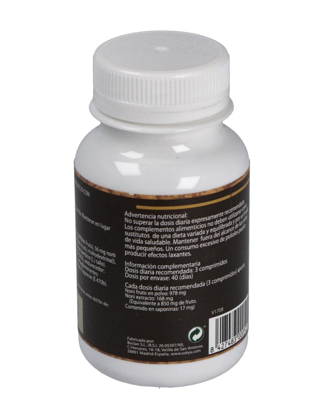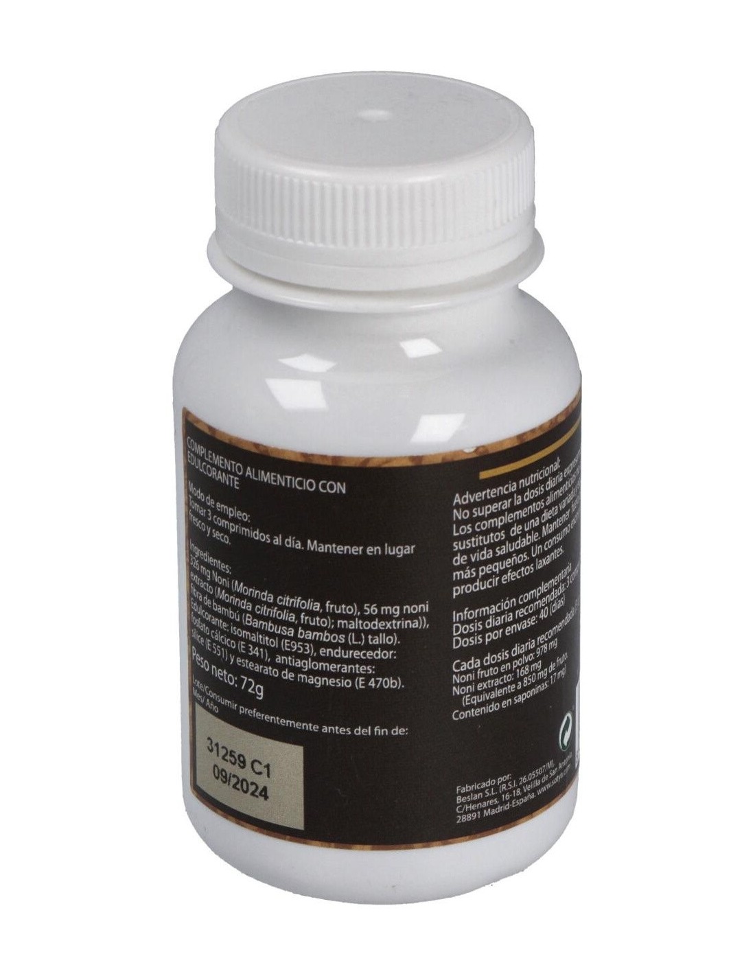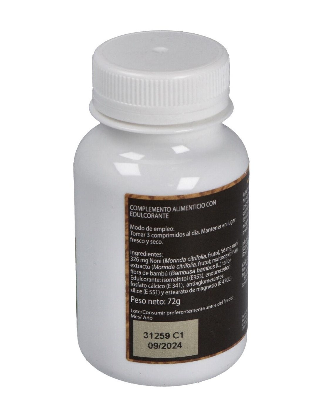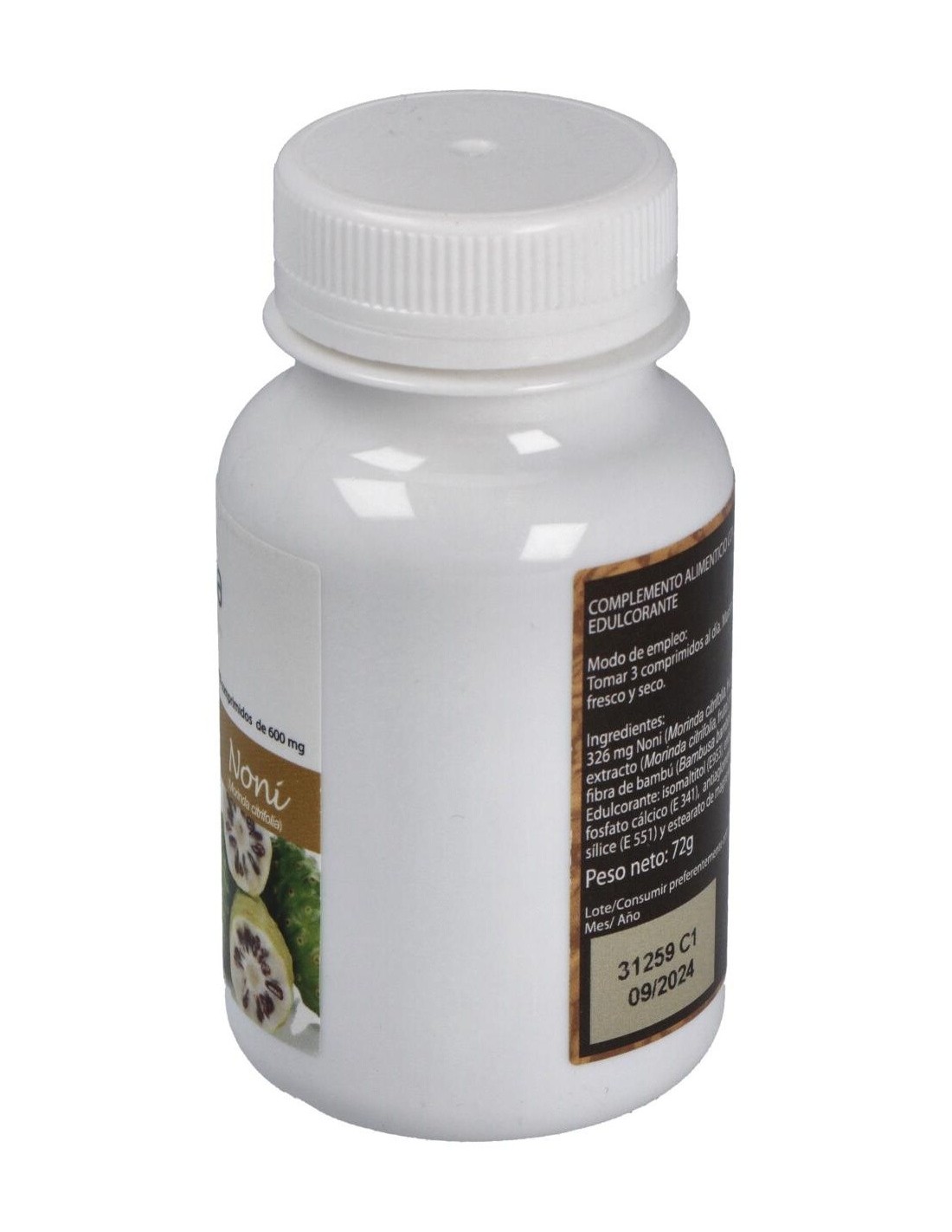 326 mg noni (fruto), 56 mg noni extracto (fruto), maltodextrina, fibra de bambú (tallo), isomaltitol E953, fosfato cálcico E341, sílice E551, estearato de magnesio E470B.
